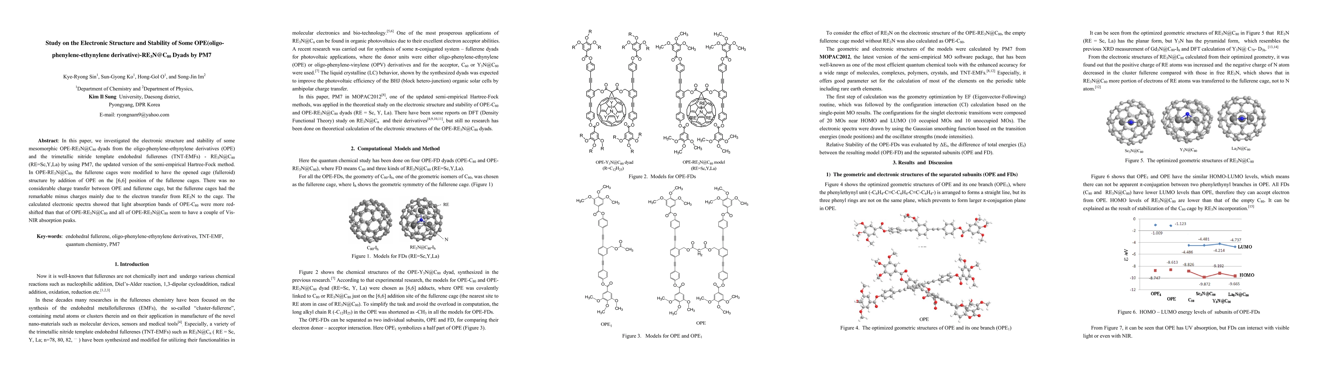In this paper, we investigated the electronic structure and stability of some mesomorphic OPE-RE3N@C80 dyads from the oligo-phenylene-ethynylene derivatives (OPE) and the trimetallic nitride template endohedral fullerenes (TNT-EMFs) - RE3N@C80 (RE=Sc,Y,La) by using PM7, the updated version of the semi-empirical Hartree-Fock method. In OPE-RE3N@C80, the fullerene cages were modified to have the opened cage (fulleroid) structure by addition of OPE on the [6,6] position of the fullerene cages. There was no considerable charge transfer between OPE and fullerene cage, but the fullerene cages had the remarkable minus charges mainly due to the electron transfer from RE3N to the cage. The calculated electronic spectra showed that light absorption bands of OPE-C80 were more red-shifted than that of OPE-RE3N@C80 and all of OPE-RE3N@C80 seem to have a couple of Vis-NIR absorption peaks.