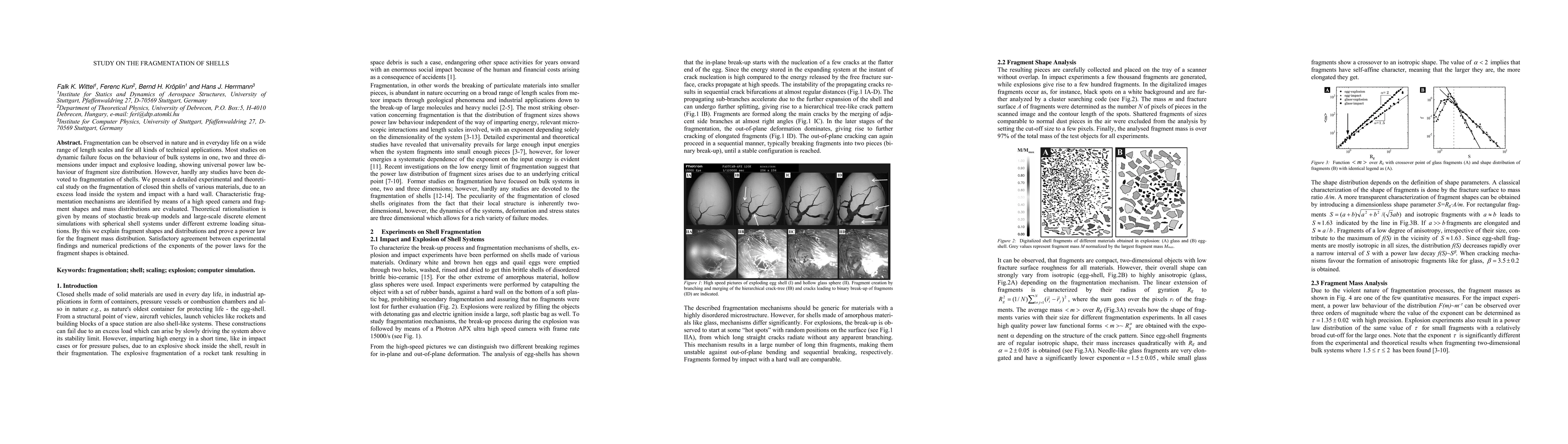 This paper investigates the fragmentation mechanisms of thin shells under internal pressure and impact, identifying characteristic patterns through high-speed imaging and theoretical models. It demonstrates a power law for fragment mass distribution and validates theoretical predictions with experimental results.