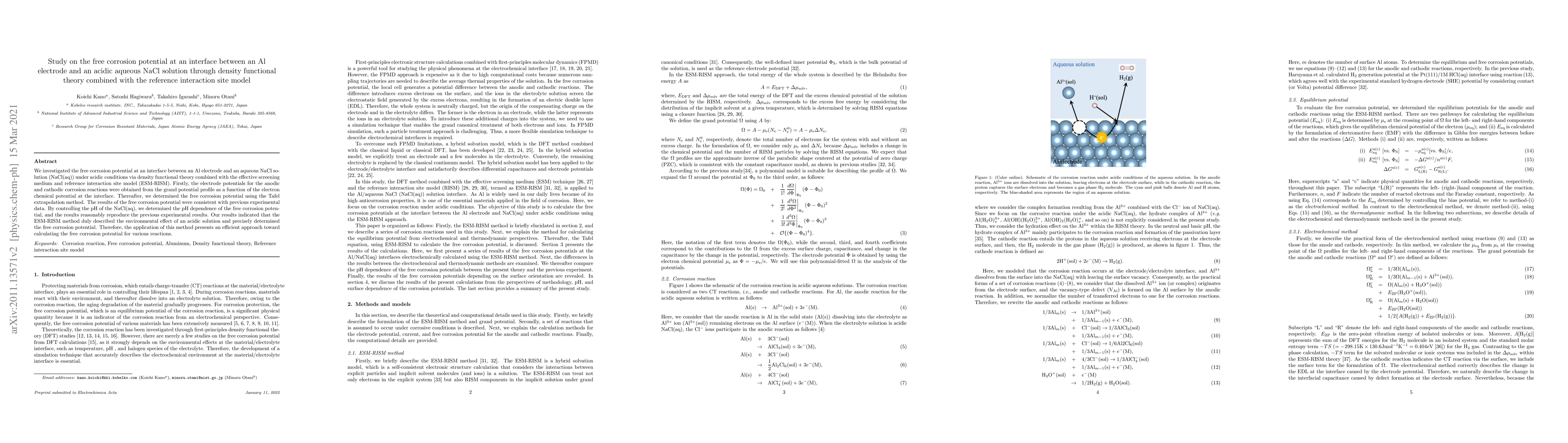 This study utilized density functional theory combined with the ESM-RISM method to calculate the free corrosion potential at the interface between an Al electrode and acidic NaCl(aq) solution, showing agreement with experimental data and highlighting the method's efficiency in determining corrosion potentials under varying pH conditions.
