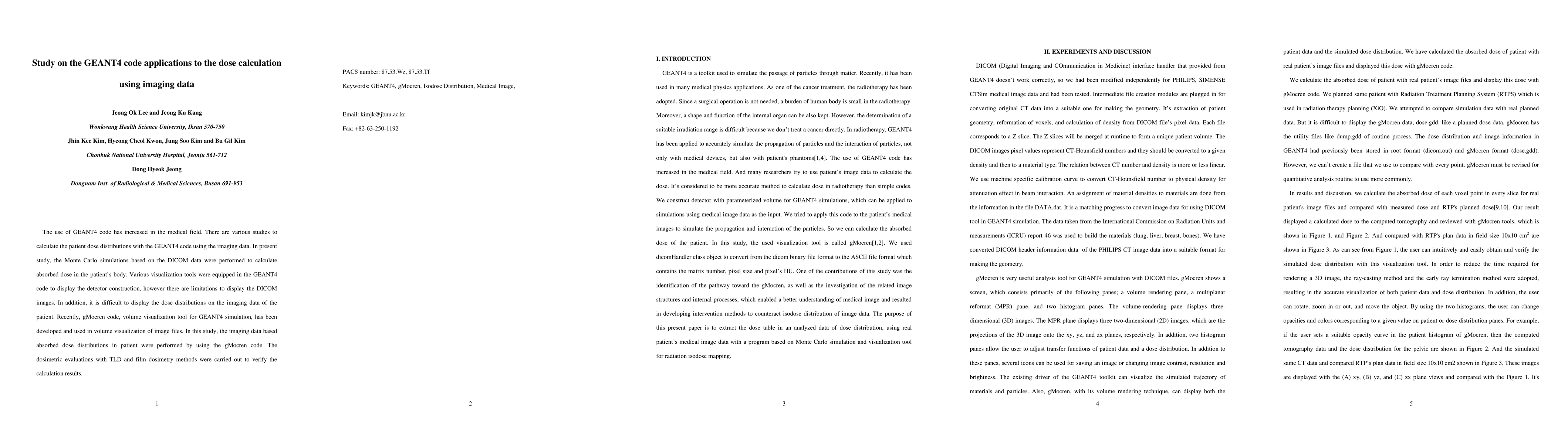 This study applies the GEANT4 code and the newly developed gMocren visualization tool to calculate absorbed dose distributions in patients using DICOM imaging data. The research verifies the Monte Carlo simulation results with TLD and film dosimetry methods.