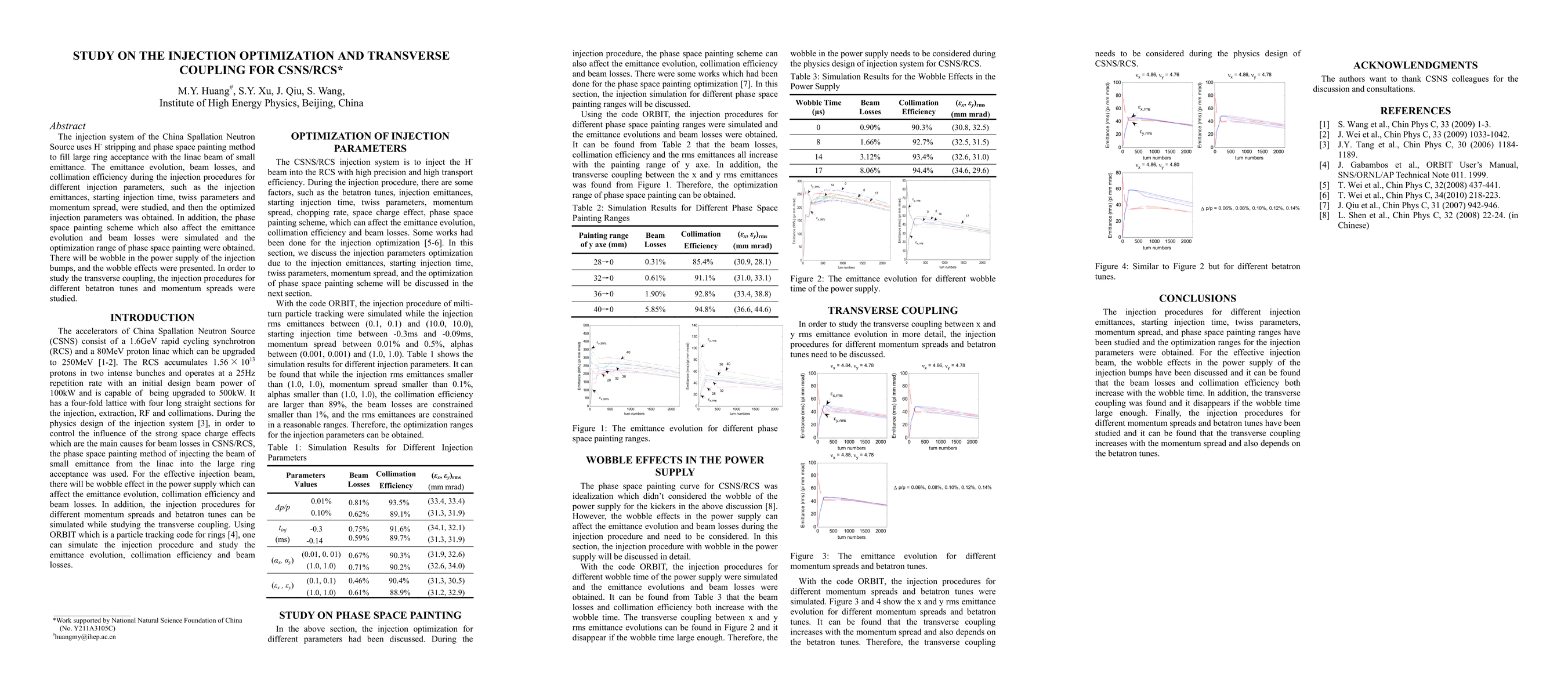 The injection system of the China Spallation Neutron Source uses H- stripping and phase space painting method to fill large ring acceptance with the linac beam of small emittance. The emittance evolution, beam losses, and collimation efficiency during the injection procedures for different injection parameters, such as the injection emittances, starting injection time, twiss parameters and momentum spread, were studied, and then the optimized injection parameters was obtained. In addition, the phase space painting scheme which also affect the emittance evolution and beam losses were simulated and the optimization range of phase space painting were obtained. There will be wobble in the power supply of the injection bumps, and the wobble effects were presented. In order to study the transverse coupling, the injection procedures for different betatron tunes and momentum spreads were studied.