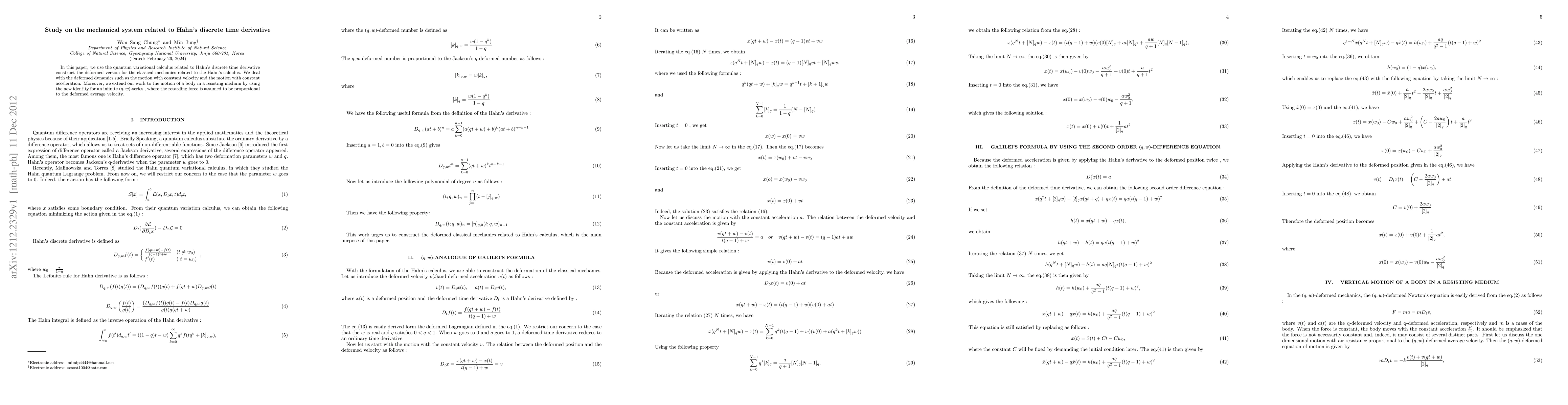 In this paper, we use the quantum variational calculus related to Hahn's discrete time derivative construct the deformed version for the classical mechanics related to the Hahn's calculus. We deal with the deformed dynamics such as the motion with constant velocity and the motion with constant acceleration. Moreover, we extend our work to the motion of a body in a resisting medium by using the new identity for an infinite ($q,w$)-series, where the retarding force is assumed to be proportional to the deformed average velocity.