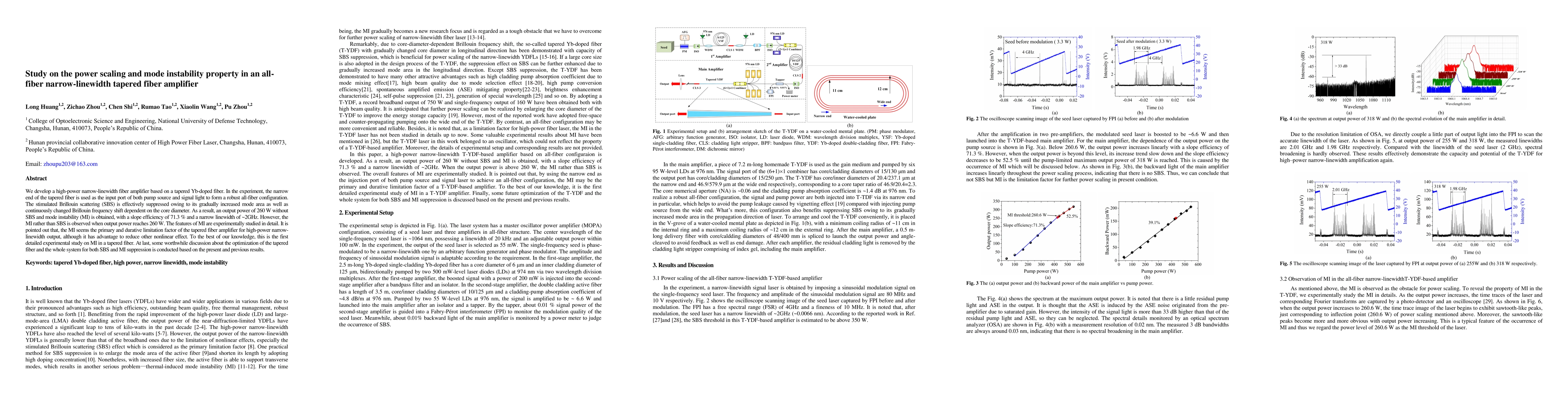This paper develops a high-power, narrow-linewidth tapered fiber amplifier with an output power of 260 W, effectively suppressing stimulated Brillouin scattering. However, mode instability emerges as the primary limitation at high power, marking the first detailed experimental study on this phenomenon in a tapered fiber.