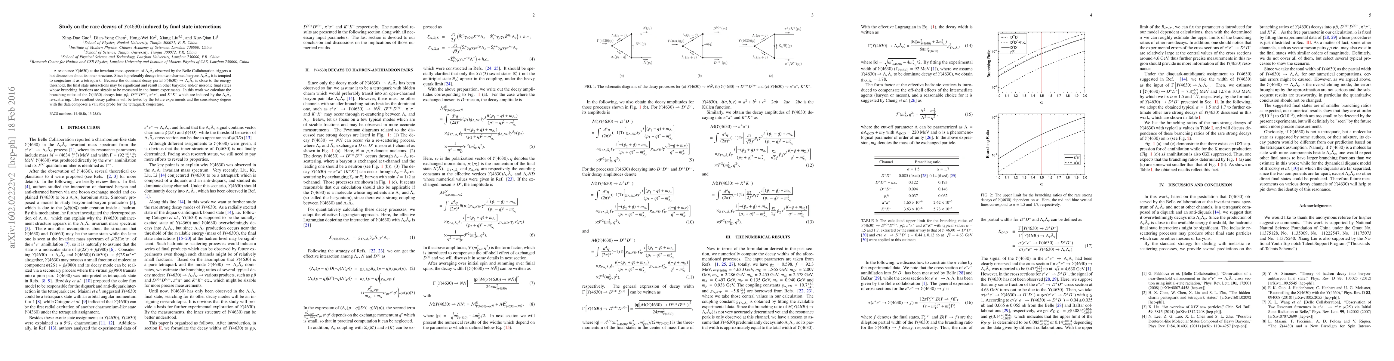 This study investigates the rare decay patterns of the $Y(4630)$ resonance, induced by final state interactions, particularly focusing on its decay into $p\bar p$, $D^{(*)+} D^{(*)-}$, $\pi^+\pi^-$, and $K^+K^-$. The findings are intended to provide a valuable probe for the tetraquark conjecture regarding the $Y(4630)$ and will be tested against future experimental data.