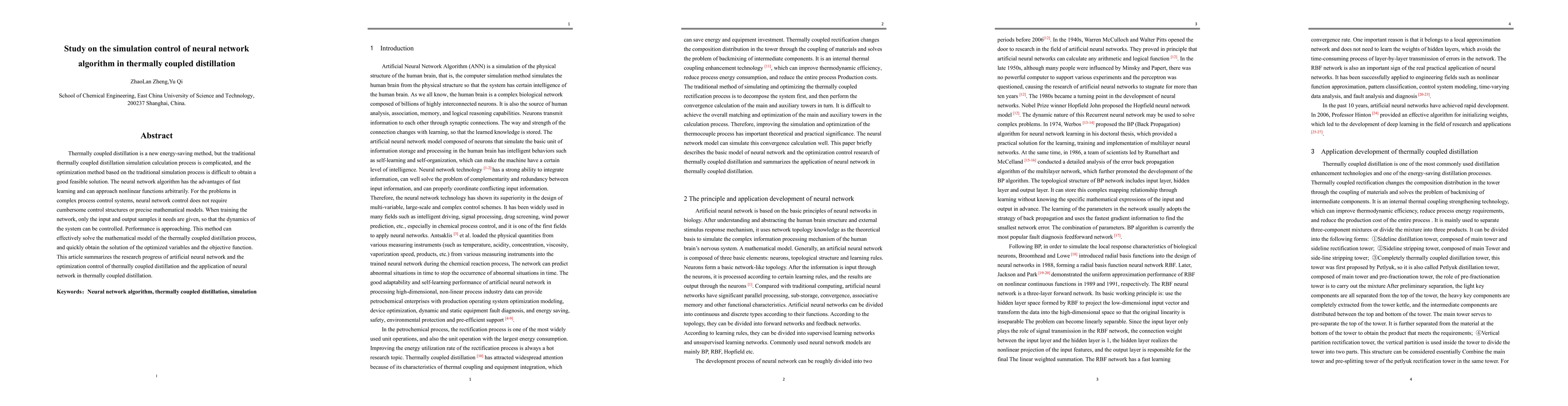 Thermally coupled distillation is a new energy-saving method, but the traditional thermally coupled distillation simulation calculation process is complicated, and the optimization method based on the traditional simulation process is difficult to obtain a good feasible solution. The neural network algorithm has the advantages of fast learning and can approach nonlinear functions arbitrarily. For the problems in complex process control systems, neural network control does not require cumbersome control structures or precise mathematical models. When training the network, only the input and output samples it needs are given, so that the dynamics of the system can be controlled. Performance is approaching. This method can effectively solve the mathematical model of the thermally coupled distillation process, and quickly obtain the solution of the optimized variables and the objective function. This article summarizes the research progress of artificial neural network and the optimization control of thermally coupled distillation and the application of neural network in thermally coupled distillation.