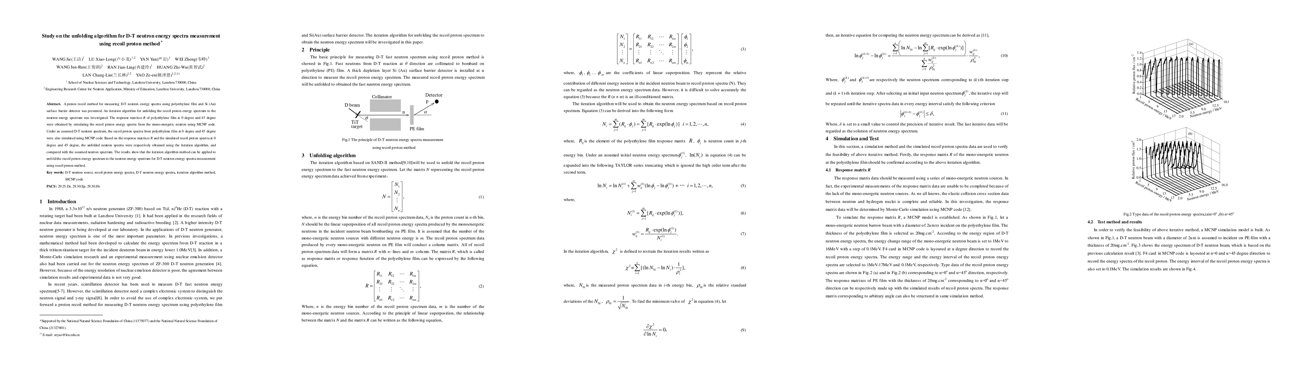 This study presents a proton recoil method for measuring D-T neutron energy spectra using polyethylene film and Si (Au) detectors, employing an iteration algorithm to unfold the proton energy spectrum. The results demonstrate the effectiveness of the algorithm in accurately reconstructing the neutron energy spectrum from simulated data.