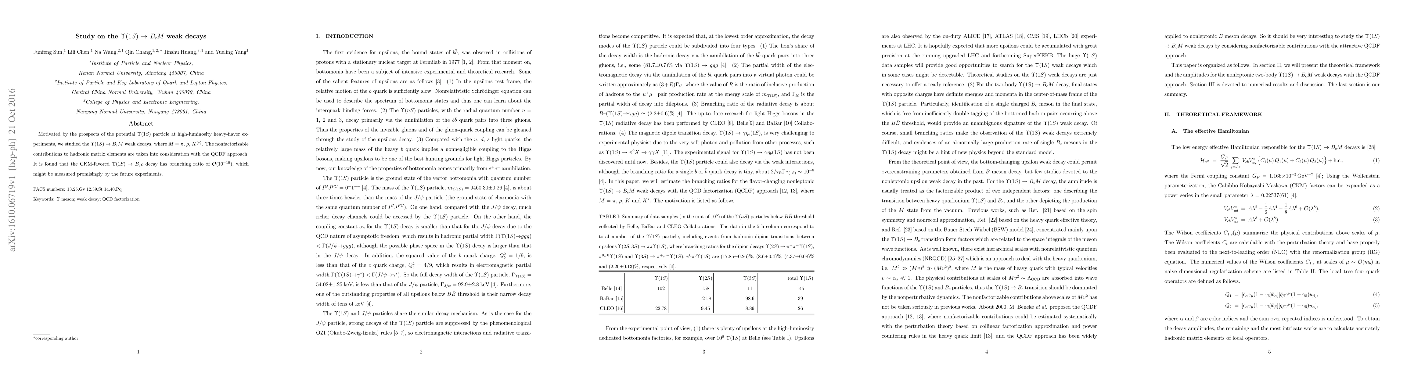 This study investigates the weak decays of the ${\Upsilon}(1S)$ particle into $B_{c}M$ where $M$ includes pions, rho mesons, and kaons, using the QCDF approach to account for nonfactorizable contributions. The favored decay ${\Upsilon}(1S) \to B_{c}{\rho}$ has a branching ratio of ${\cal O}(10^{-10})$, suggesting a promising measurement opportunity for future high-luminosity heavy-flavor experiments.