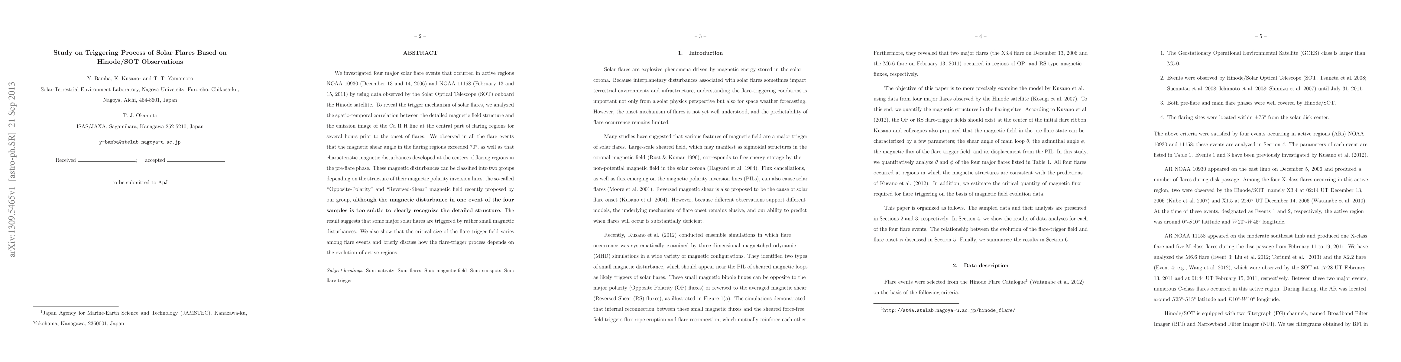 This study analyzes four major solar flare events using Hinode/SOT observations to reveal the trigger mechanism. It finds that magnetic shear angles exceeding 70 degrees and characteristic magnetic disturbances precede flares, suggesting that small magnetic disturbances can trigger major solar flares.