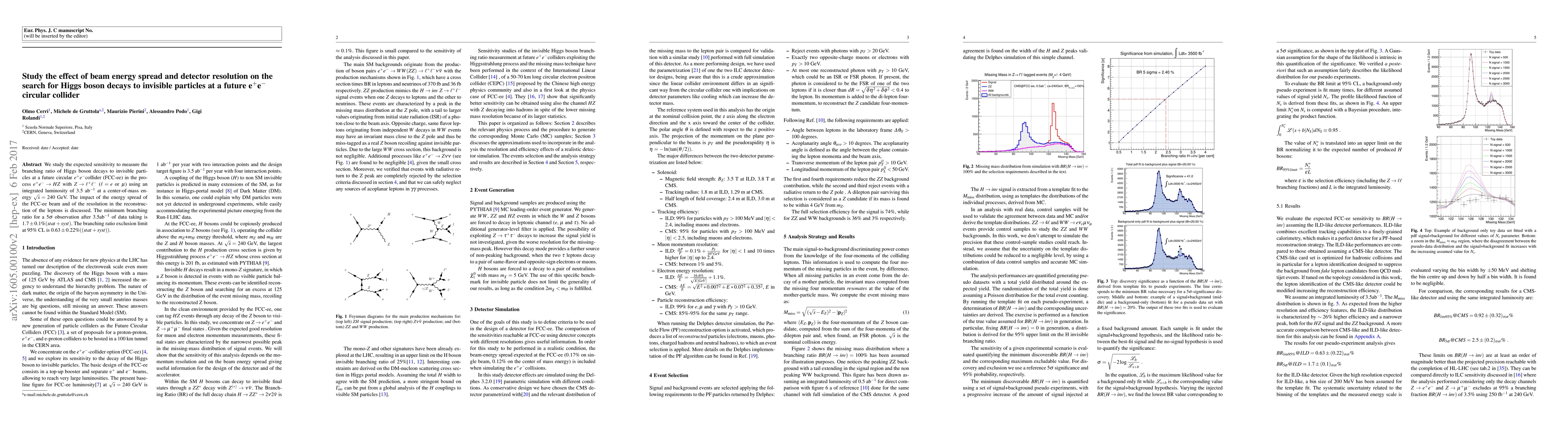 Researchers studied how energy spread and detector resolution affect detecting Higgs boson decays to invisible particles at a future circular collider, finding a minimum branching ratio for $5 ext{ }oldsymbol{ au}$ observation of $1.7 ext{ }pm 0.1 ext{ %}$. The study aimed to guide the design of detectors for future experiments.