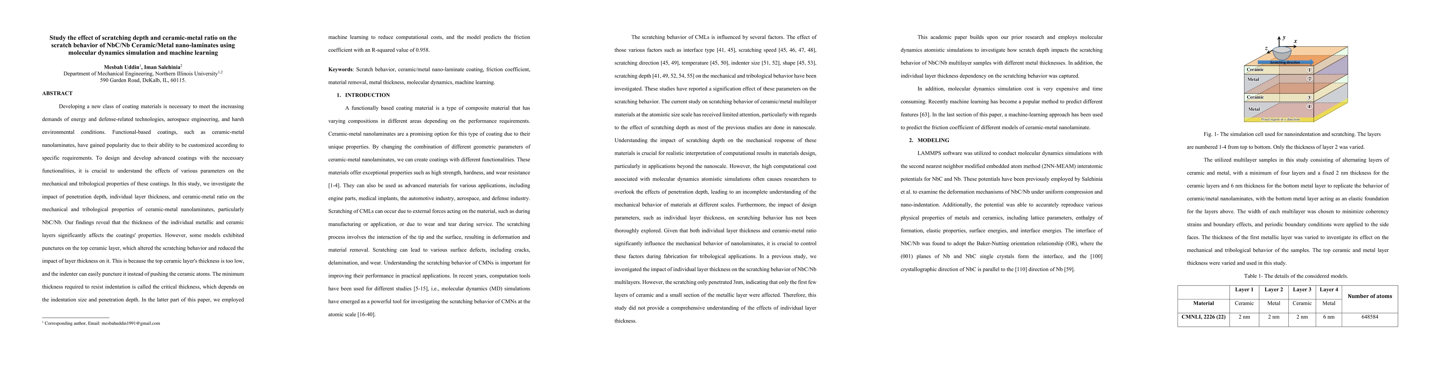 This study uses molecular dynamics and machine learning to analyze how scratching depth and ceramic-metal ratio influence the scratch behavior of NbC/Nb nanolaminates. Findings show that layer thickness significantly affects mechanical properties, but low ceramic layer thickness can lead to punctures, altering scratching behavior. Machine learning models predict friction coefficients with high accuracy.