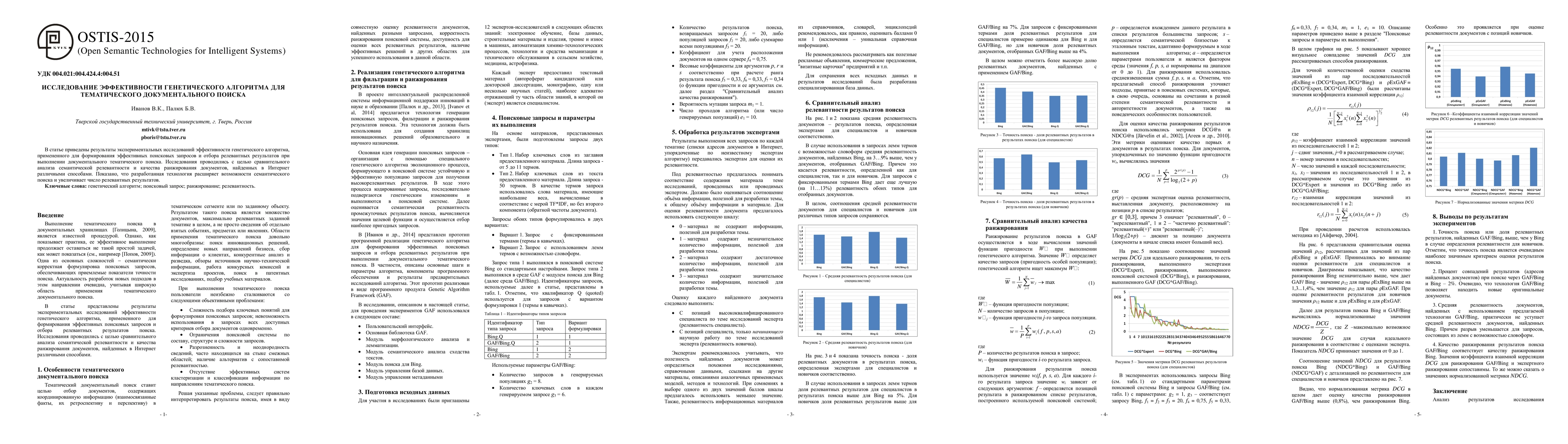 This article presents results of experimental studies the effectiveness of the genetic algorithm that was applied to effective queries creation and relevant document selection. Studies were carried out to the comparative analysis of the semantic relevance and quality ranking of the documents found on the Internet in various ways. Analysis of the results shows that the greatest effect of presented technology is achieved by finding new documents for skilled users in the initial stages of the study of the topic. Additionally, the number of unique and relevant results is significantly increased.