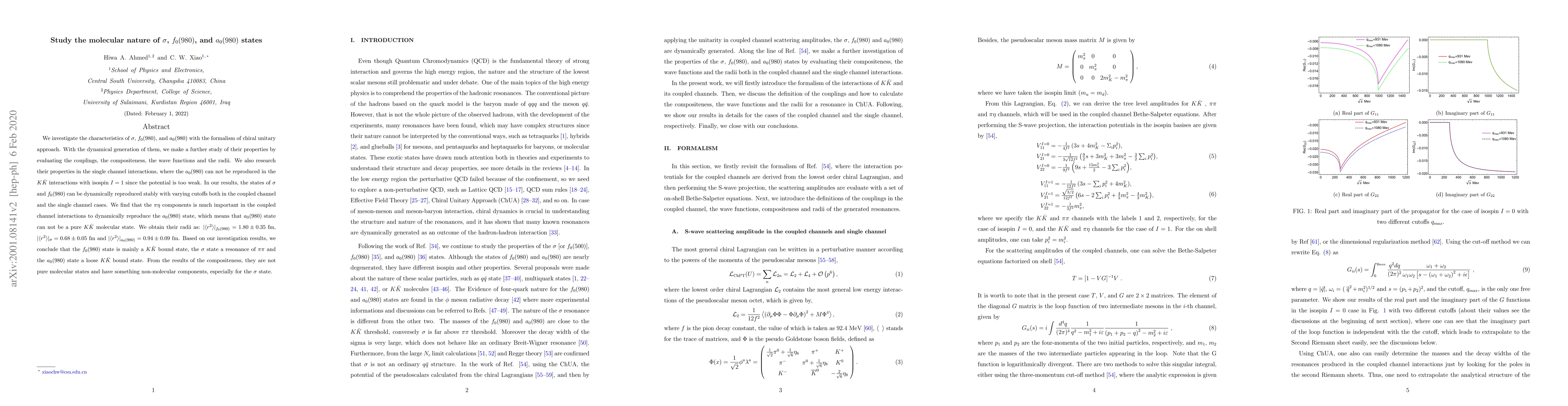 The study investigates the molecular nature of sigma, f0(980), and a0(980) states using chiral unitary approach, revealing that f0(980) is a Kar{K} bound state, sigma is a resonance of piar{pi}, and a0(980) has non-molecular components.