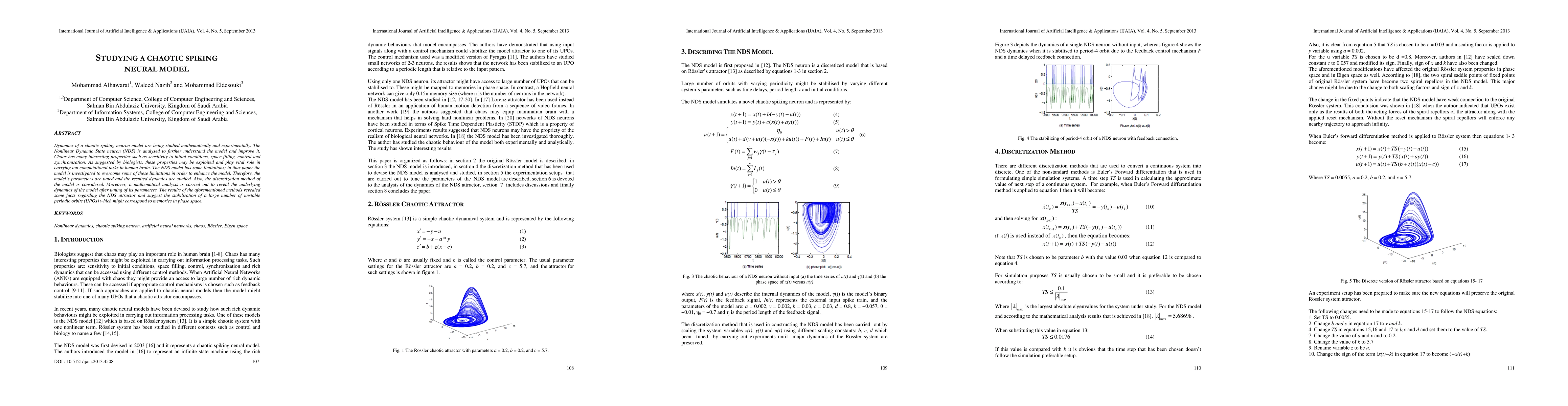 This paper investigates the chaotic dynamics of a Nonlinear Dynamic State (NDS) spiking neural model both mathematically and experimentally. The study aims to overcome model limitations by tuning parameters and analyzing discretization, revealing enhanced dynamics and stabilization of unstable periodic orbits potentially linked to memory storage.