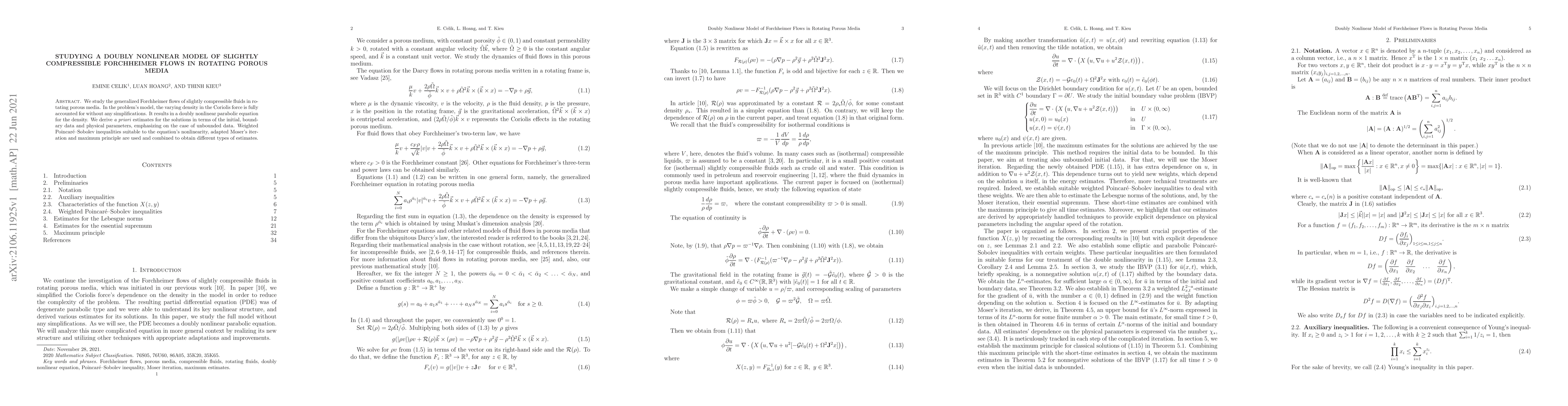 This paper investigates a generalized Forchheimer model for slightly compressible fluid flows in rotating porous media, deriving a priori estimates for solutions without simplifying the Coriolis force. The study employs weighted Poincaré-Sobolev inequalities, adapted Moser's iteration, and the maximum principle to handle the doubly nonlinear parabolic equation and analyze unbounded data scenarios.
