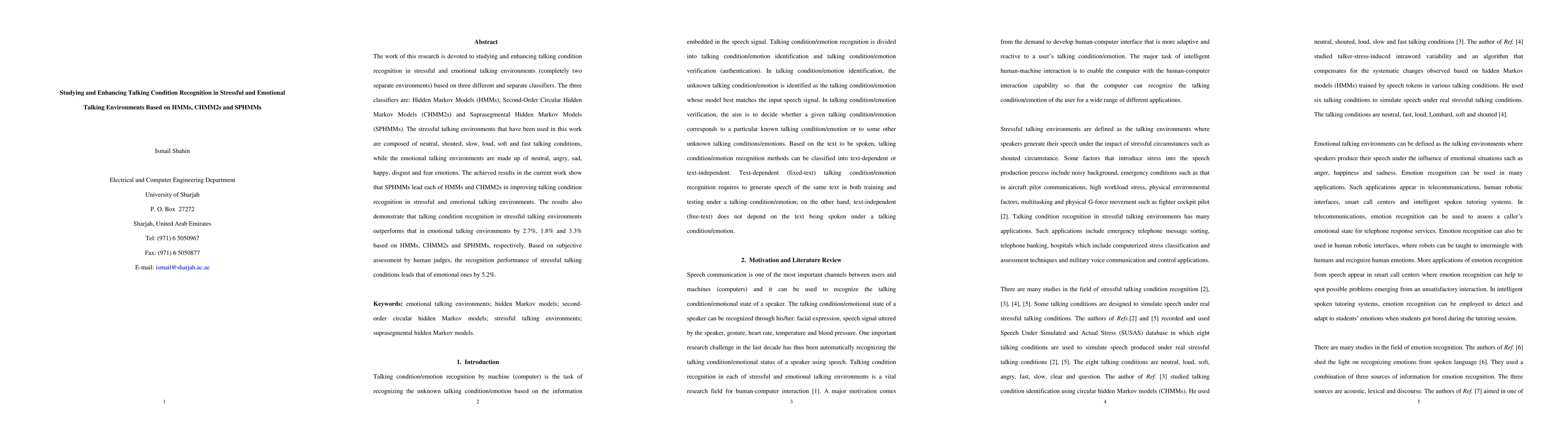 This research investigates the enhancement of talking condition recognition in stressful and emotional environments using HMMs, CHMM2s, and SPHMMs. SPHMMs outperform HMMs and CHMM2s in both environments, with stressful conditions yielding better recognition rates by 2.7% to 3.3% depending on the model used.