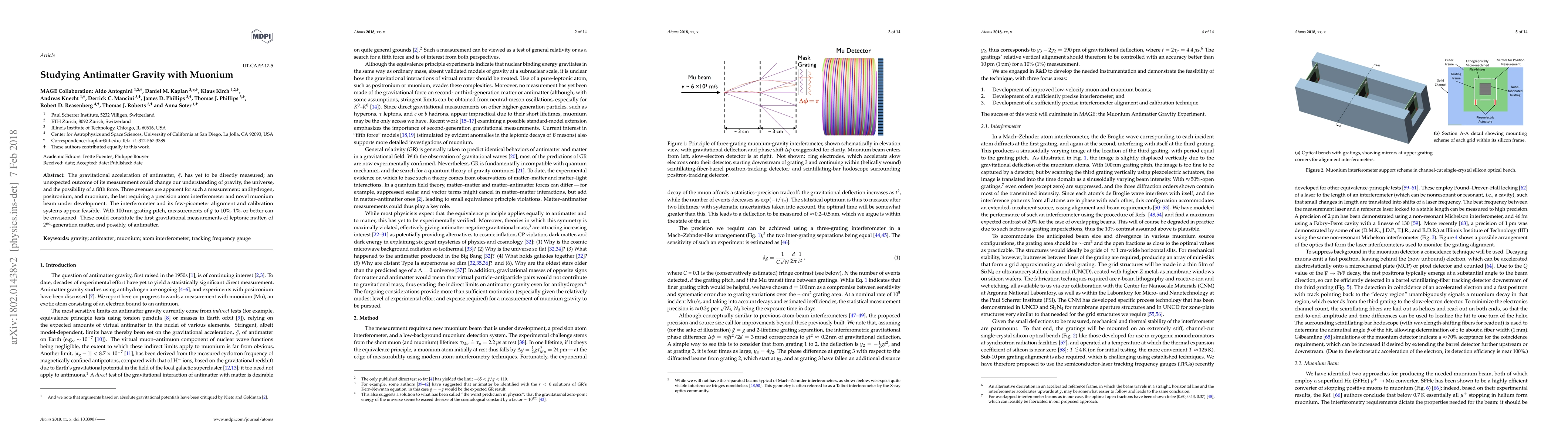 The gravitational acceleration of antimatter, gbar, has yet to be directly measured; an unexpected outcome of its measurement could change our understanding of gravity, the universe, and the possibility of a fifth force. Three avenues are apparent for such a measurement: antihydrogen, positronium, and muonium, the last requiring a precision atom interferometer and novel muonium beam under development. The interferometer and its few-picometer alignment and calibration systems appear feasible. With 100 nm grating pitch, measurements of gbar to 10%, 1%, or better can be envisioned. These could constitute the first gravitational measurements of leptonic matter, of 2nd-generation matter, and possibly, of antimatter.