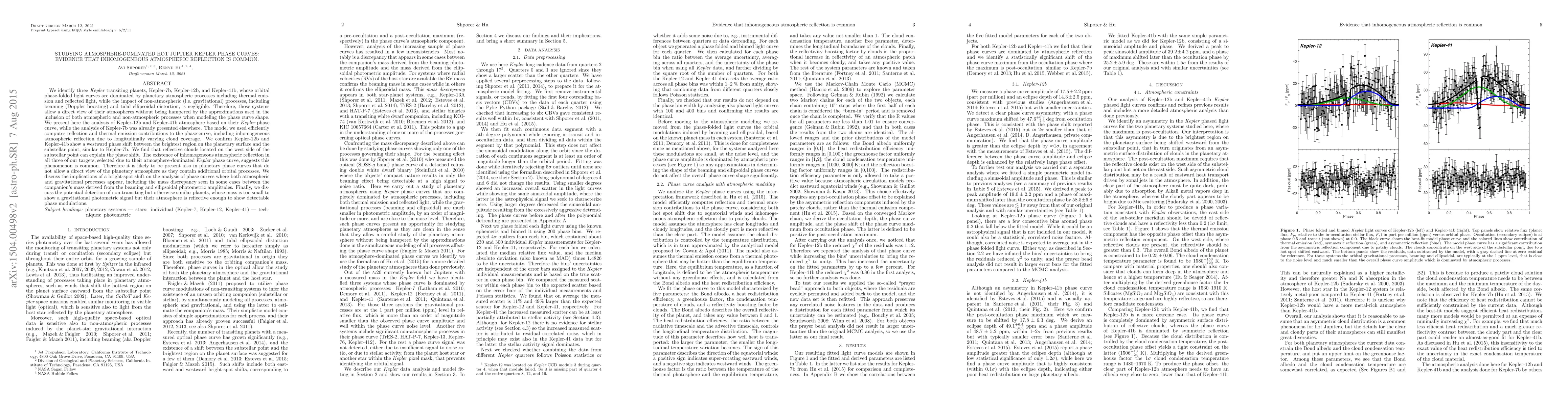 (abridged) We identify 3 Kepler transiting planets, Kepler-7b, Kepler-12b, and Kepler-41b, whose orbital phase-folded light curves are dominated by planetary atmospheric processes including thermal emission and reflected light, while the impact of non-atmospheric (i.e. gravitational) processes, including beaming (Doppler boosting) and tidal ellipsoidal distortion, is negligible. Therefore, those systems allow a direct view of their atmospheres without being hampered by the approximations used in the inclusion of both atmospheric and non-atmospheric processes when modeling the phase curve shape. Here we analyze Kepler-12b and Kepler-41b atmosphere based on their Kepler phase curve, while the analysis of Kepler-7b was presented elsewhere. The model we used efficiently computes reflection and thermal emission contributions to the phase curve, including inhomogeneous atmospheric reflection due to longitudinally varying cloud coverage. We confirm Kepler-12b and Kepler-41b show a westward phase shift between the brightest region on the planetary surface and the substellar point, similar to Kepler-7b. We find that reflective clouds located on the west side of the substellar point can explain the phase shift. The existence of inhomogeneous atmospheric reflection in all 3 of our targets, selected due to their atmosphere-dominated Kepler phase curve, suggests this phenomenon is common. Therefore it is likely to be present also in planetary phase curves that do not allow a direct view of the planetary atmosphere as they contain additional orbital processes. We discuss the implications of a bright-spot shift on the analysis of phase curves where both atmospheric and gravitational processes appear. We also discuss the potential detection of non-transiting but otherwise similar planets, whose mass is too small to show a gravitational photometric signal but their atmospheric signal is detectable.