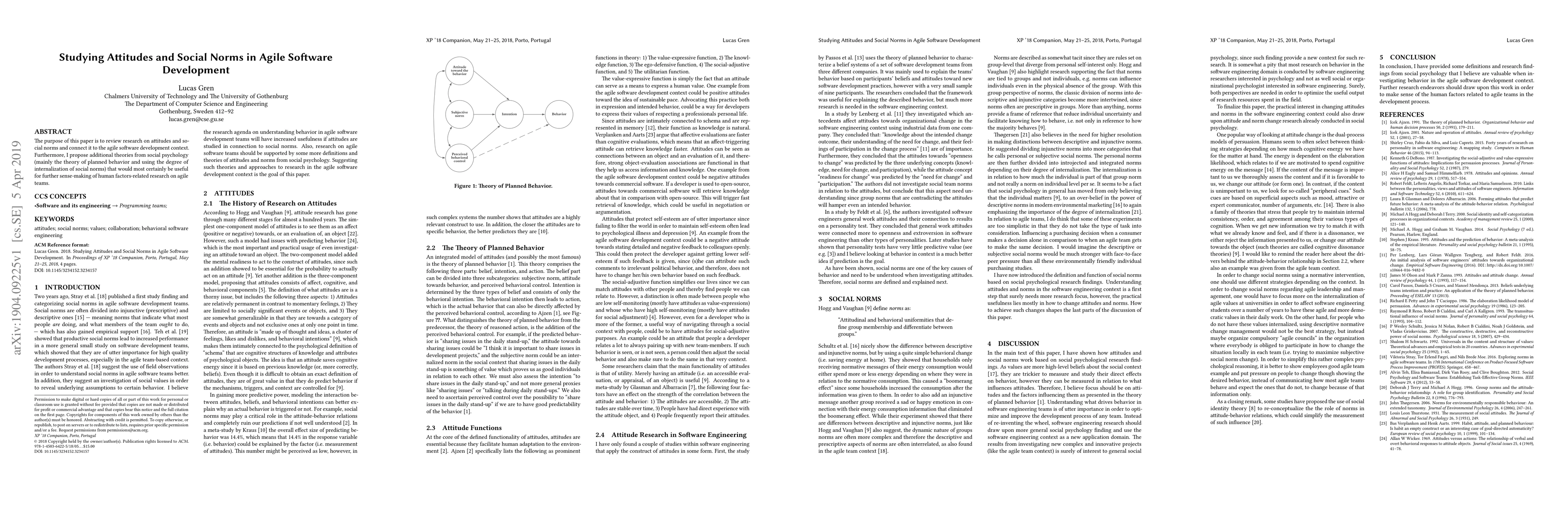 This paper reviews research on attitudes and social norms and applies them to agile software development, proposing the theory of planned behavior and the degree of internalization of social norms to better understand human factors in agile teams.