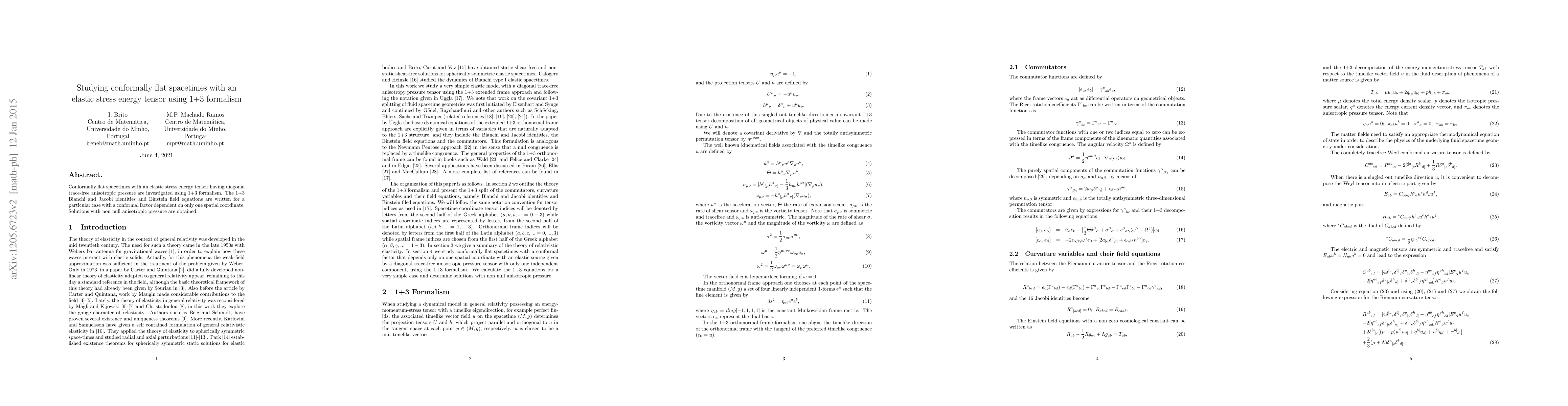 Conformally flat spacetimes with an elastic stress energy tensor given by a diagonal trace-free anisotropic pressure tensor are investigated using 1+3 formalism. We show how the null tetrad Ricci components are related to the pressure components and energy density. The 1+3 Bianchi and Jacobi identities and Einstein field equations are written for this particular case. In general the commutators must be considered since they supply potentially new information on higher order derivatives of the 1+3 quantities. We solve the system for the non rotating case which consist of ODEs of a spatial coordinate.
