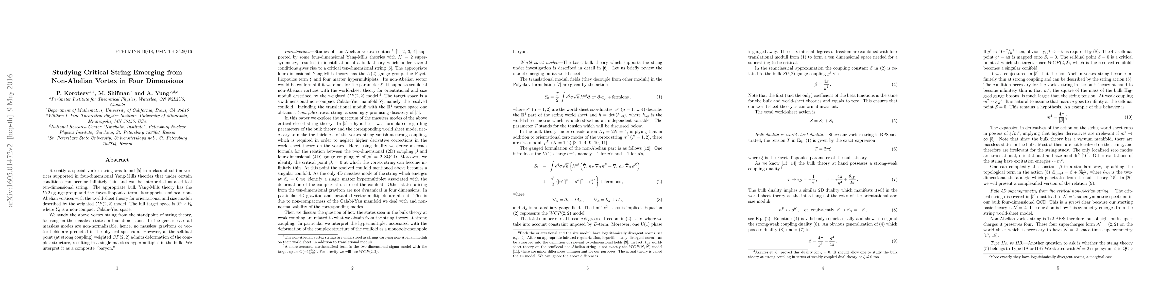This paper examines a critical string emerging from a non-Abelian vortex in four-dimensional Yang-Mills theory. In the generic case, the string does not predict massless gravitons or vector fields; however, at the selfdual point, it yields a single massless hypermultiplet interpreted as a composite "baryon."