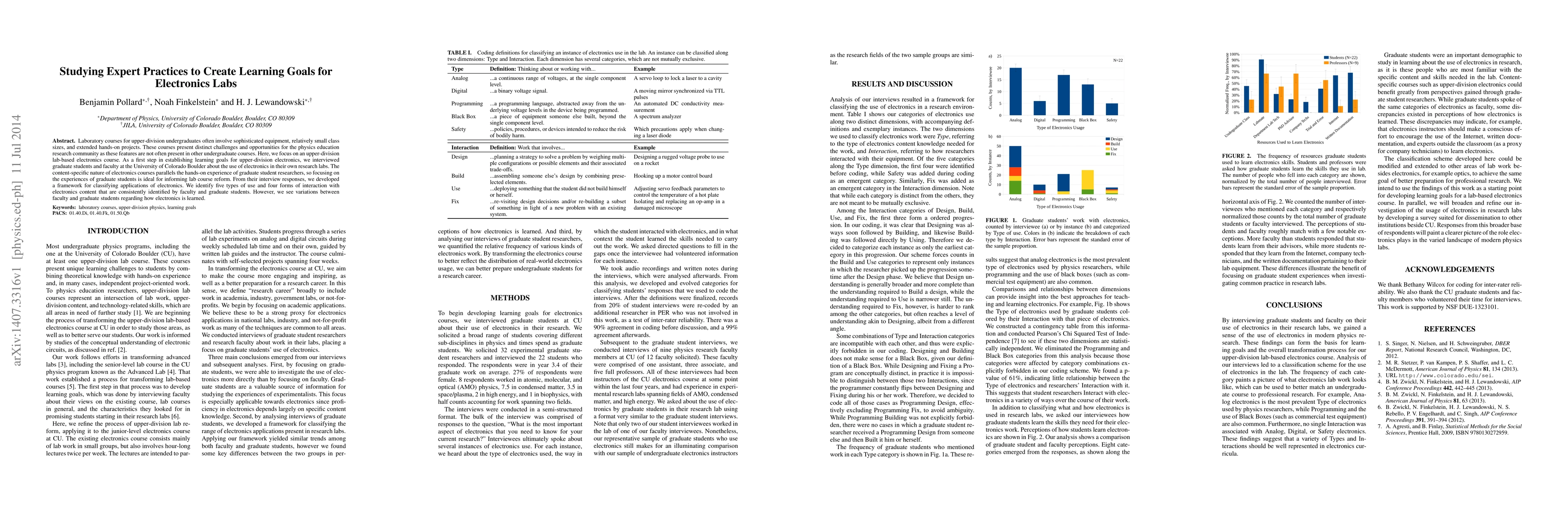 Laboratory courses for upper-division undergraduates often involve sophisticated equipment, relatively small class sizes, and extended hands-on projects. These courses present distinct challenges and opportunities for the physics education research community as these features are not often present in other undergraduate courses. Here, we focus on an upper-division lab-based electronics course. As a first step in establishing learning goals for upper-division electronics, we interviewed graduate students and faculty at the University of Colorado Boulder about the use of electronics in their own research labs. The content-specific nature of electronics courses parallels the hands-on experience of graduate student researchers, so focusing on the experiences of graduate students is ideal for informing lab course reform. From their interview responses, we developed a framework for classifying applications of electronics. We identify five types of use and four forms of interaction with electronics content that are consistently identified by faculty and graduate students. However, we see variations between faculty and graduate students regarding how electronics is learned.