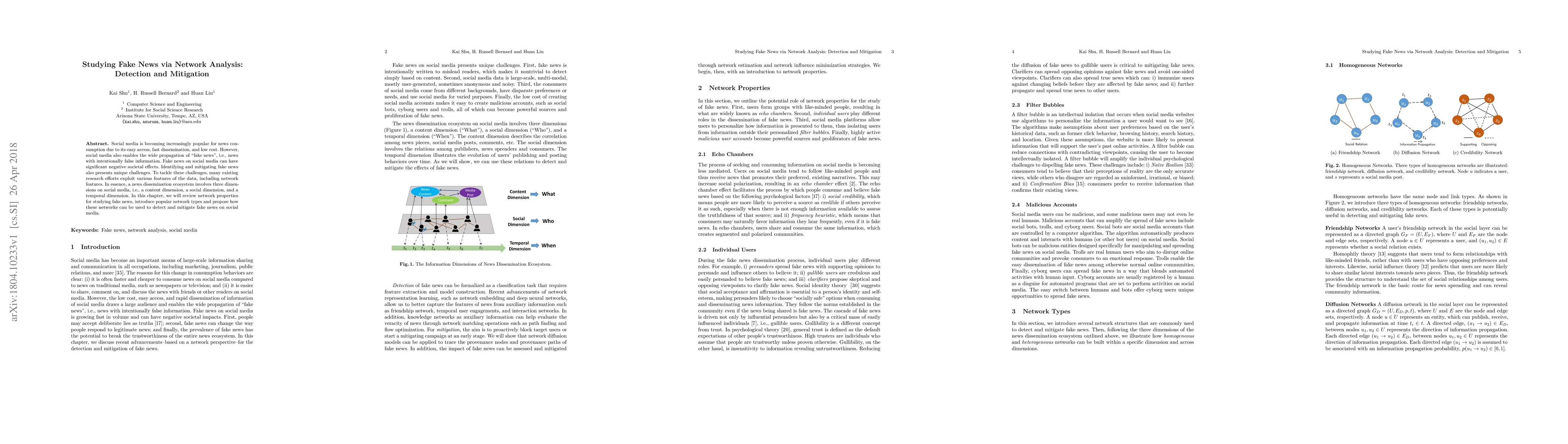 Social media for news consumption is becoming increasingly popular due to its easy access, fast dissemination, and low cost. However, social media also enable the wide propagation of "fake news", i.e., news with intentionally false information. Fake news on social media poses significant negative societal effects, and also presents unique challenges. To tackle the challenges, many existing works exploit various features, from a network perspective, to detect and mitigate fake news. In essence, news dissemination ecosystem involves three dimensions on social media, i.e., a content dimension, a social dimension, and a temporal dimension. In this chapter, we will review network properties for studying fake news, introduce popular network types and how these networks can be used to detect and mitigation fake news on social media.