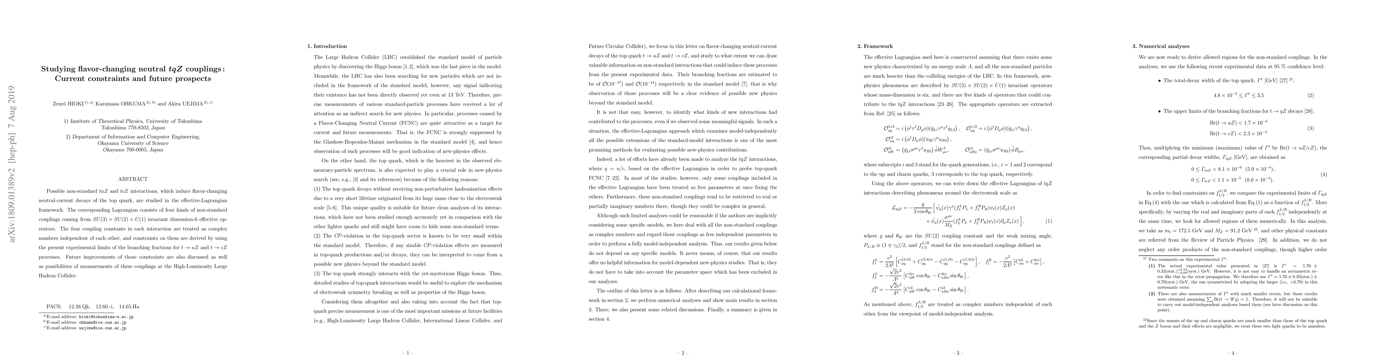Possible non-standard tuZ and tcZ interactions, which induce flavor-changing neutral-current decays of the top quark, are studied in the effective-Lagrangian framework. The corresponding Lagrangian consists of four kinds of non-standard couplings coming from SU(3)xSU(2)xU(1) invariant dimension-6 effective operators. The four coupling constants in each interaction are treated as complex numbers independent of each other, and constraints on them are derived by using the present experimental limits of the branching fractions for t -> u Z and t -> c Z processes. Future improvements of those constraints are also discussed as well as possibilities of measurements of these couplings at the High-Luminosity Large Hadron Collider.