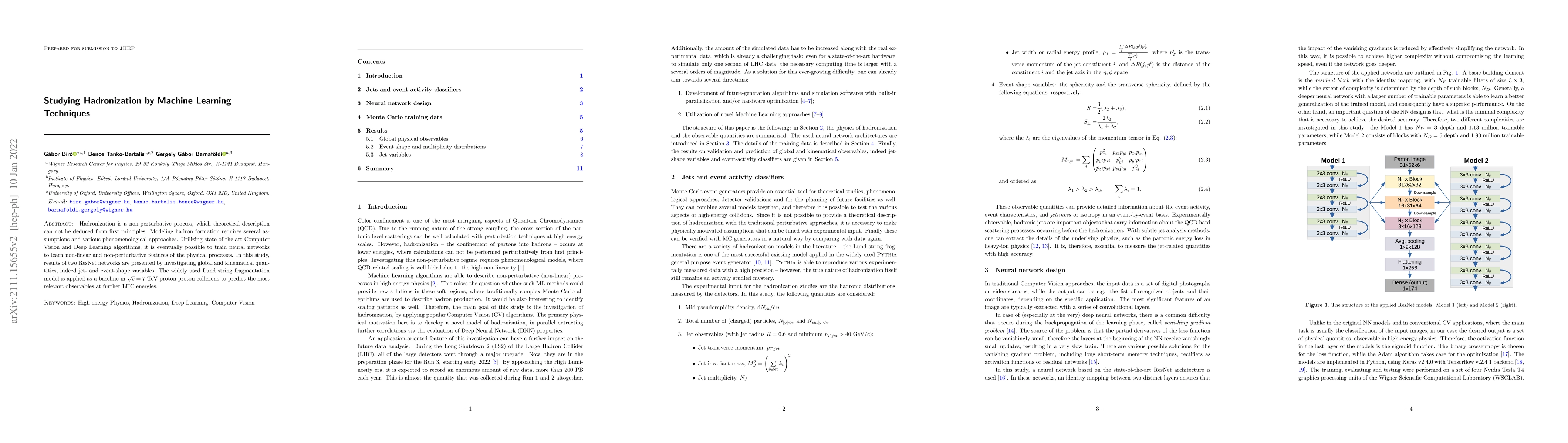 Hadronization is a non-perturbative process, which theoretical description can not be deduced from first principles. Modeling hadron formation requires several assumptions and various phenomenological approaches. Utilizing state-of-the-art Computer Vision and Deep Learning algorithms, it is eventually possible to train neural networks to learn non-linear and non-perturbative features of the physical processes. In this study, results of two ResNet networks are presented by investigating global and kinematical quantities, indeed jet- and event-shape variables. The widely used Lund string fragmentation model is applied as a baseline in $\sqrt{s}= 7$ TeV proton-proton collisions to predict the most relevant observables at further LHC energies.