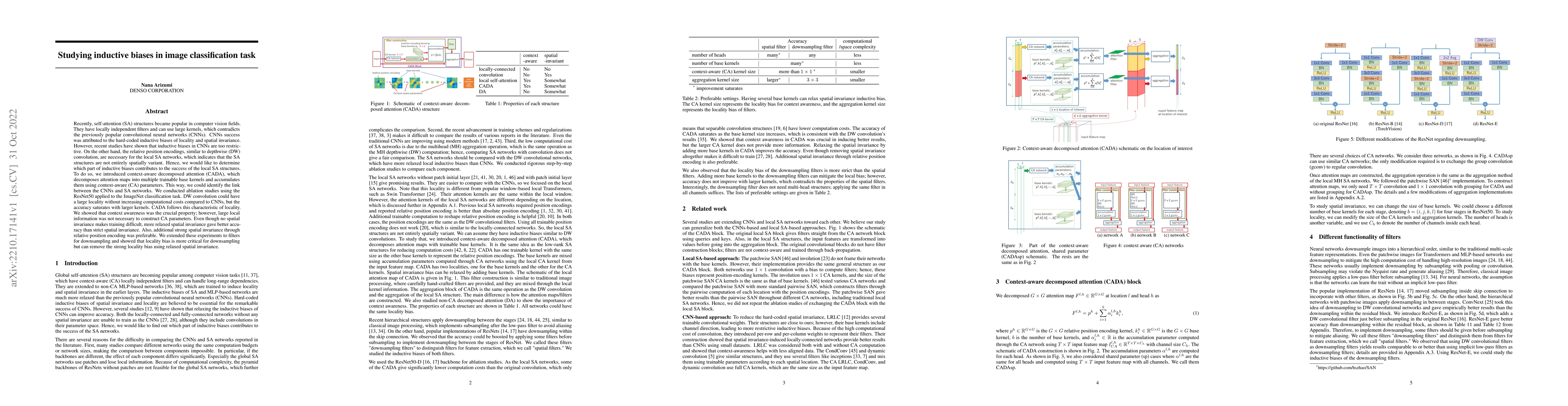 This paper investigates the inductive biases in self-attention structures compared to convolutional neural networks (CNNs) for image classification. The study introduces context-aware decomposed attention (CADA) to analyze the contributions of locality and spatial invariance, finding that context awareness is crucial, while strict spatial invariance is less beneficial than a more relaxed form.