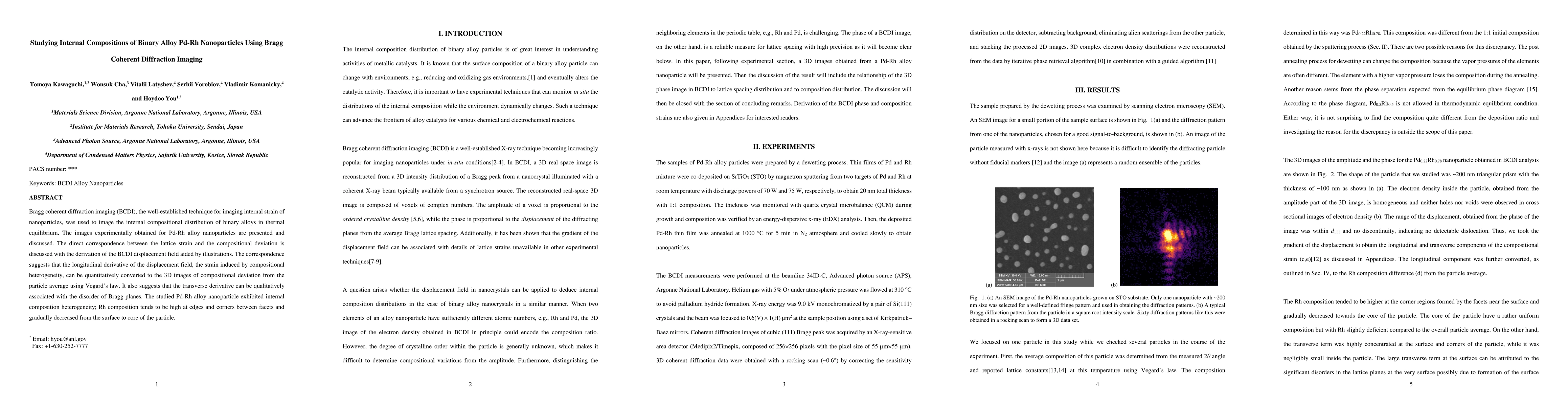 This study employs Bragg coherent diffraction imaging (BCDI) to visualize the internal compositional distribution of Pd-Rh alloy nanoparticles, revealing the direct relationship between lattice strain and compositional deviation in thermal equilibrium. The BCDI displacement field aids in understanding these compositional variations.