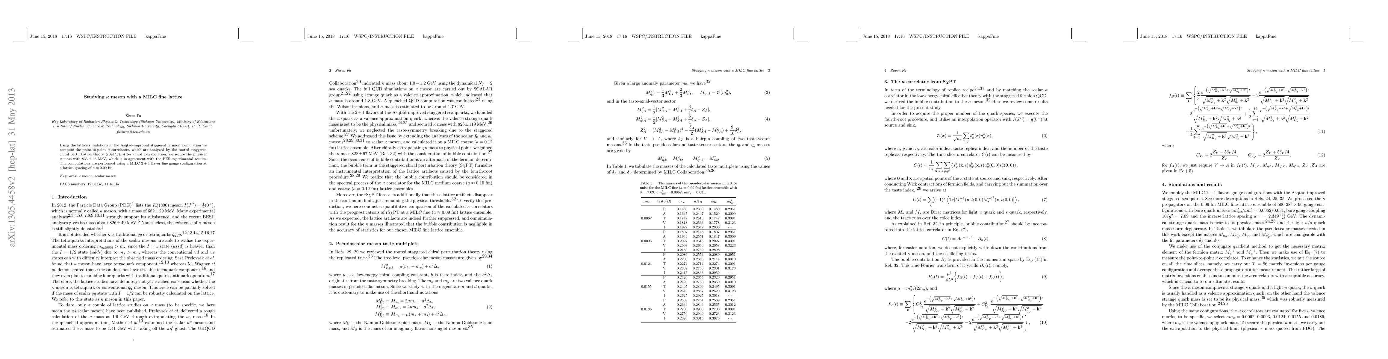Using the lattice simulations in the Asqtad-improved staggered fermion formulation we compute the point-to-point $\kappa$ correlators, which are analyzed by the rooted staggered chiral perturbation theory (rS$\chi$PT). After chiral extrapolation, we secure the physical $\kappa$ mass with $835\pm93$ MeV, which is in agreement with the BES experimental results. The computations are performed using a MILC 2+1 flavor fine gauge configuration at a lattice spacing of $a \approx 0.09$ fm.