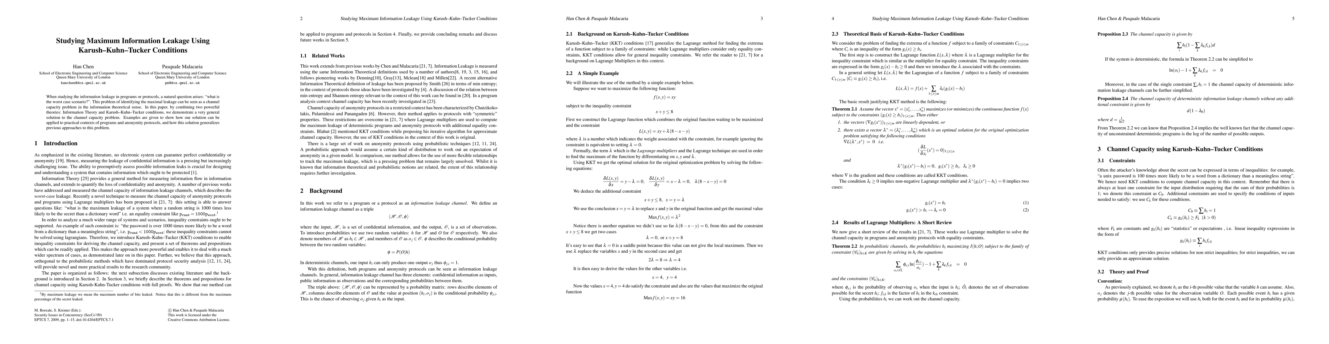 This paper uses Information Theory and Karush-Kuhn-Tucker conditions to develop a general solution for identifying maximal information leakage in programs or protocols, improving on previous approaches with practical examples.