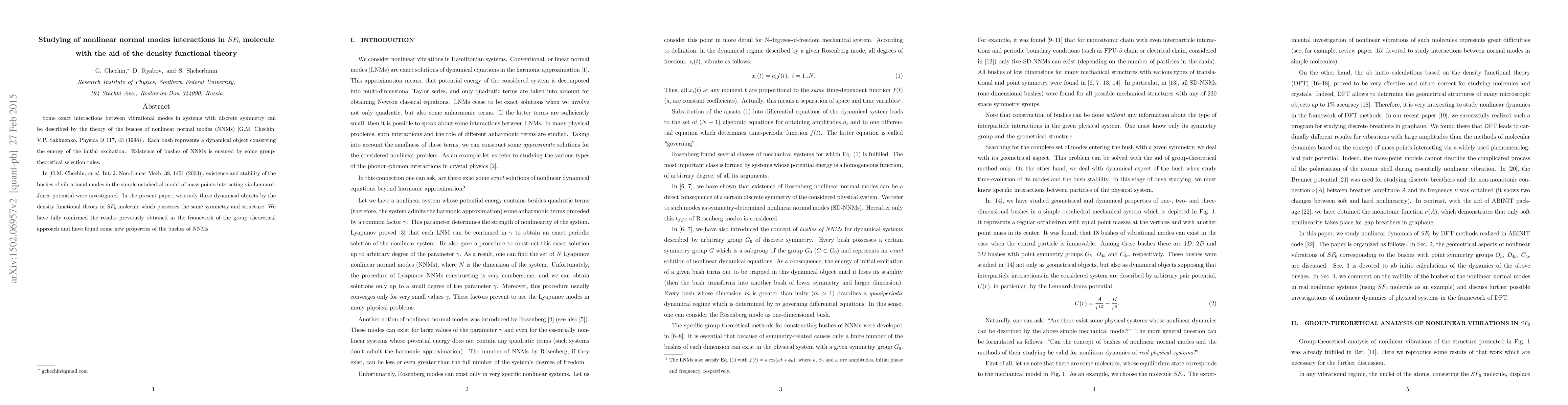 Some exact interactions between vibrational modes in systems with discrete symmetry can be described by the theory of the bushes of nonlinear normal modes (NNMs) [G.M. Chechin, V.P. Sakhnenko. Physica D 117, 43 (1998)]. Each bush represents a dynamical object conserving the energy of the initial excitation. Existence of bushes of NNMs is ensured by some group-theoretical selection rules. In [G.M. Chechin, et al. Int. J. Non-Linear Mech. 38, 1451 (2003)], existence and stability of the bushes of vibrational modes in the simple octahedral model of mass points interacting via Lennard-Jones potential were investigated. In the present paper, we study these dynamical objects by the density functional theory in SF6 molecule which possesses the same symmetry and structure. We have fully confirmed the results previously obtained in the framework of the group theoretical approach and have found some new properties of the bushes of NNMs.