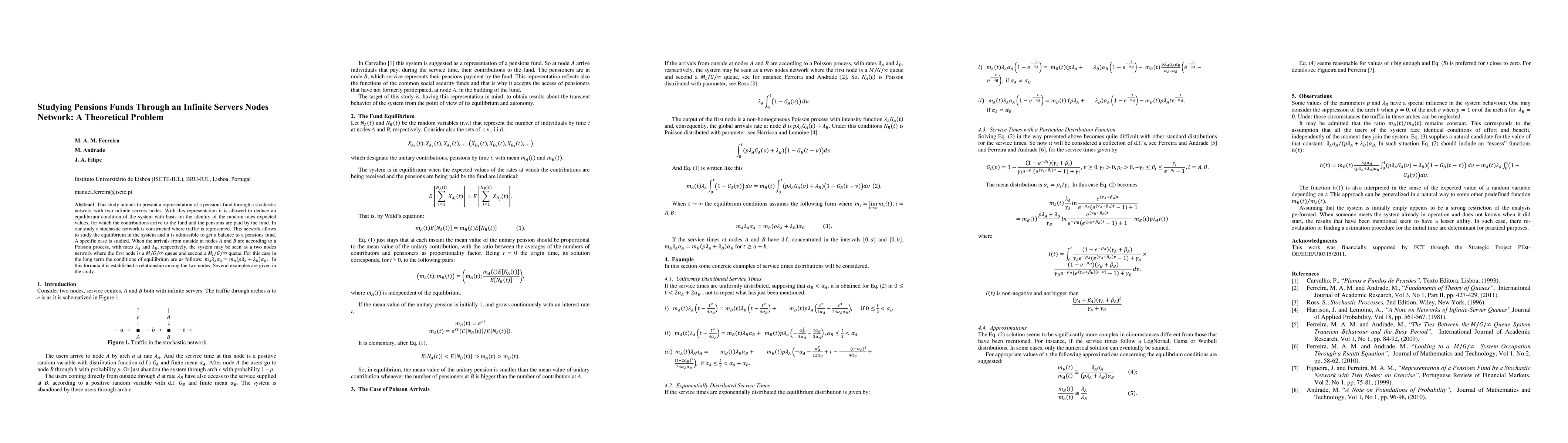 Researchers study pensions funds as a stochastic network with two infinite servers nodes to find equilibrium conditions based on arrival rates and payments. They propose a simple formula for long-term conditions in a specific case where arrivals follow Poisson processes.