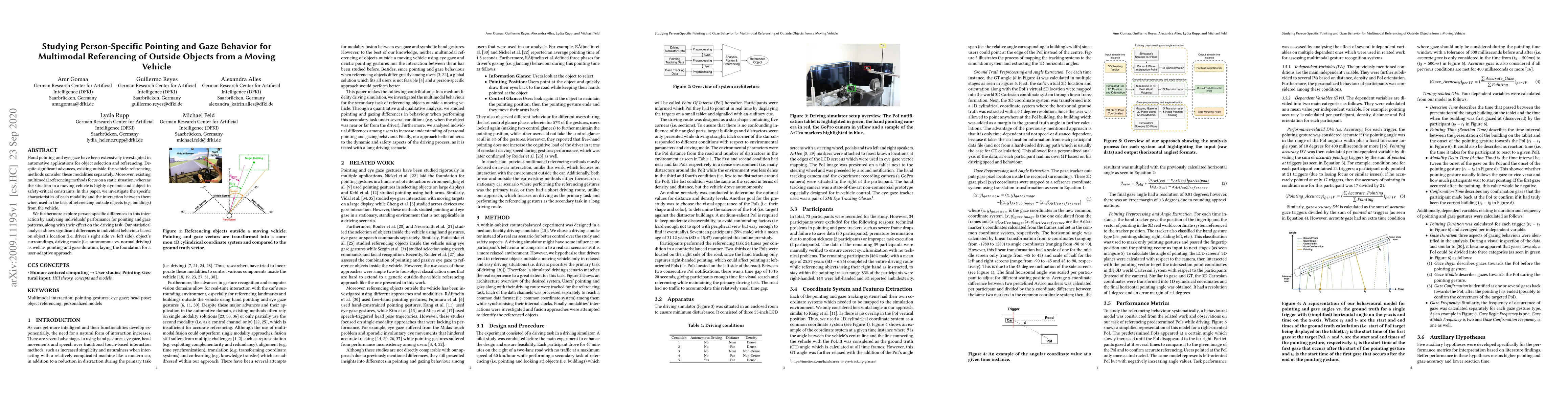 This paper examines how hand pointing and eye gaze interact for referencing outside objects while in a moving vehicle, highlighting individual differences in these multimodal behaviors. Statistical analysis reveals significant variations in performance based on object location, surroundings, driving mode, and the duration of pointing and gaze, suggesting a need for user-adaptive systems.