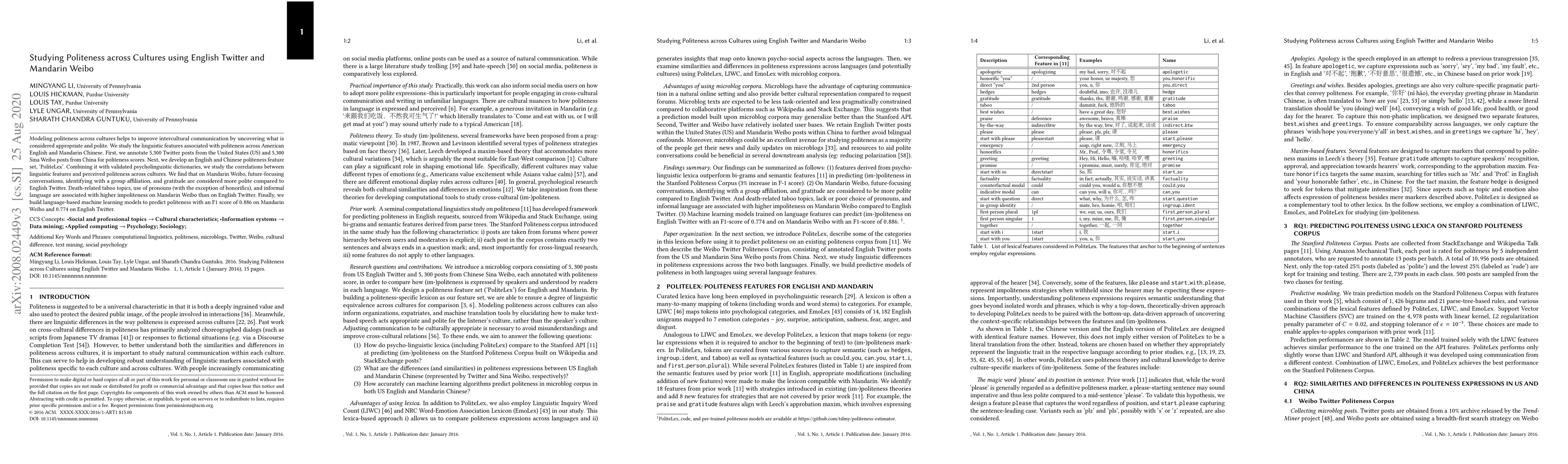This study investigates linguistic features of politeness in US English and Mandarin Chinese through Twitter and Sina Weibo posts, revealing cultural differences in politeness perceptions and developing a machine learning model to predict politeness with high accuracy.