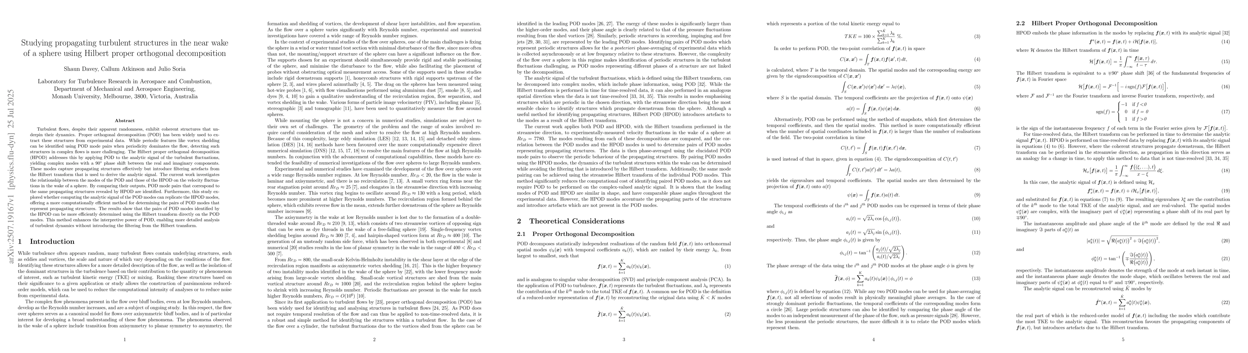 Turbulent flows, despite their apparent randomness, exhibit coherent structures that underpin their dynamics. Proper orthogonal decomposition (POD) has been widely used to extract these structures from experimental data. While periodic features like vortex shedding can be identified using POD mode pairs when periodicity dominates the flow, detecting such structures in complex flows is more challenging. The Hilbert proper orthogonal decomposition (HPOD) addresses this by applying POD to the analytic signal of the turbulent fluctuations, yielding complex modes with a $90^\circ$ phase shift between the real and imaginary components. These modes capture propagating structures effectively but introduce filtering artefacts from the Hilbert transform that is used to derive the analytic signal. The current work investigates the relationship between the modes of the POD and those of the HPOD on the velocity fluctuations in the wake of a sphere. By comparing their outputs, POD mode pairs that correspond to the same propagating structures revealed by HPOD are identified. Furthermore, this study explored whether computing the analytic signal of the POD modes can replicate the HPOD modes, offering a more computationally efficient method for determining the pairs of POD modes that represent propagating structures. The results show that the pairs of POD modes identified by the HPOD can be more efficiently determined using the Hilbert transform directly on the POD modes. This method enhances the interpretive power of POD, enabling more detailed analysis of turbulent dynamics without introducing the filtering from the Hilbert transform.