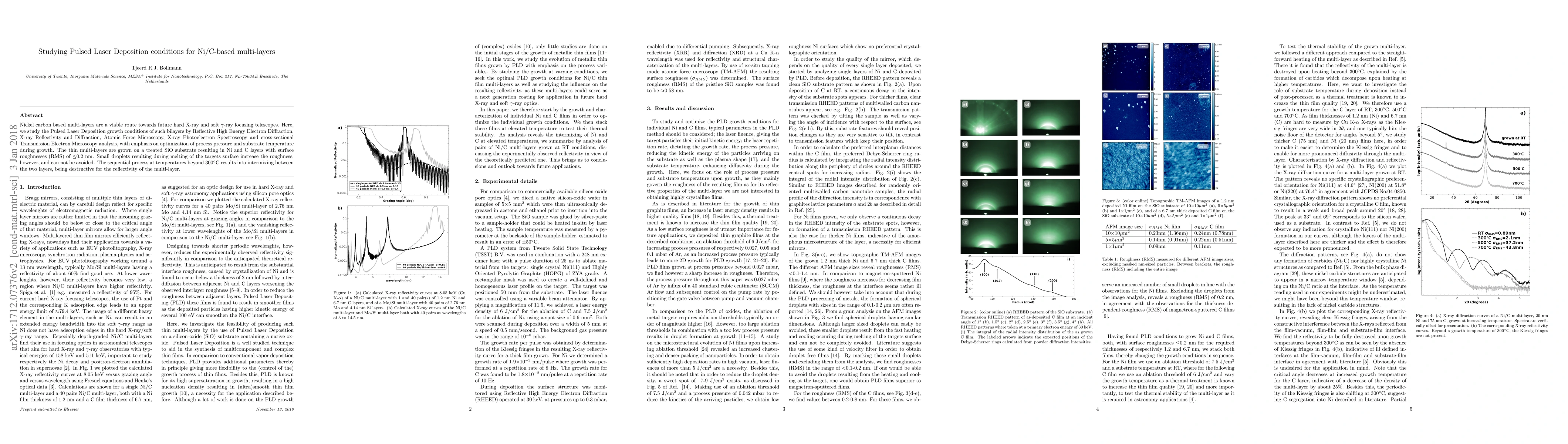 Nickel carbon based multi-layers are a viable route towards future hard X-ray and soft $\gamma$-ray focusing telescopes. Here, we study the Pulsed Laser Deposition growth conditions of such bilayers by Reflective High Energy Electron Diffraction, X-ray Reflectivity and Diffraction, Atomic Force Microscopy, X-ray Photoelectron Spectroscopy and cross-sectional Transmission Electron Microscopy analysis, with emphasis on optimization of process pressure and substrate temperature during growth. The thin multi-layers are grown on a treated SiO substrate resulting in Ni and C layers with surface roughnesses (RMS) of $\leq$0.2 nm. Small droplets resulting during melting of the targets surface increase the roughness, however, and can not be avoided. The sequential process at temperatures beyond 300$^\circ$C results into intermixing between the two layers, being destructive for the reflectivity of the multi-layer.