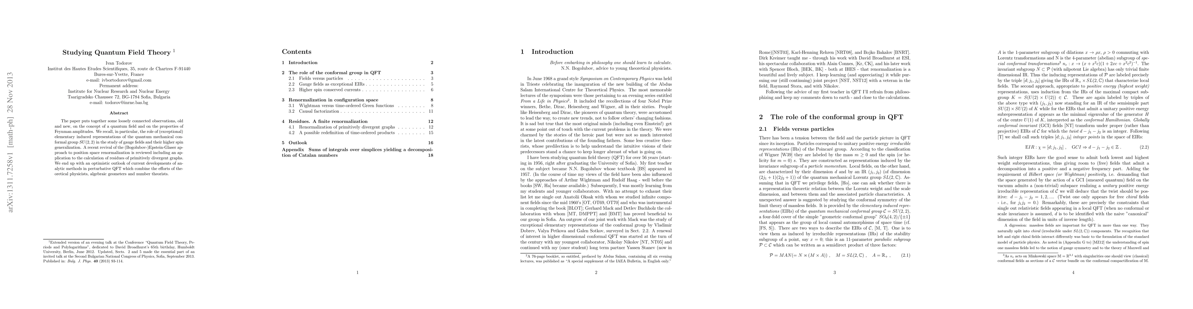The paper puts together some loosely connected observations, old and new, on the concept of a quantum field and on the properties of Feynman amplitudes. We recall, in particular, the role of (exceptional) elementary induced representations of the quantum mechanical conformal group SU(2,2) in the study of gauge fields and their higher spin generalization. A recent revival of the (Bogolubov-)Epstein-Glaser approach to position space renormalization is reviewed including an application to the calculation of residues of primitively divergent graphs. We end up with an optimistic outlook of current developments of analytic methods in perturbative QFT which combine the efforts of theoretical physicists, algebraic geometers and number theorists.