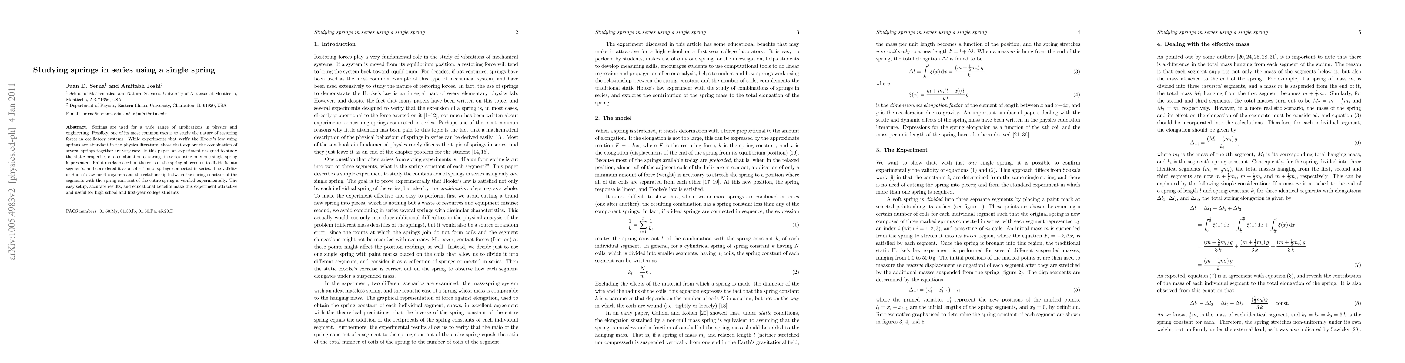 Researchers studied a single spring used in series to explore how springs interact, verifying Hooke's law and finding relationships between segment and total spring constants. The experiment is an easy, accurate setup suitable for high school and college students.