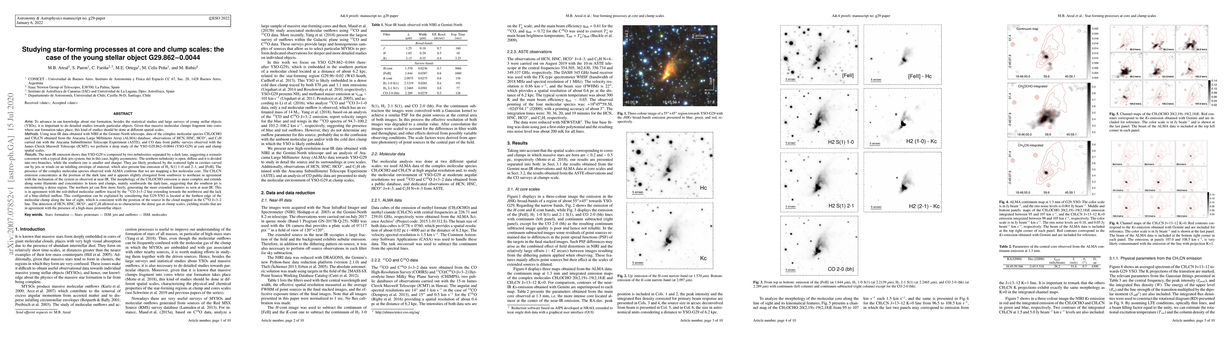 Massive molecular clumps fragment into cores where star formation takes place, hence star-forming studies should be done at different spatial scales. Using near-IR data obtained with Gemini, data of CH3OCHO and CH3CN from the ALMA database, observations of HCN, HNC, HCO+, and C2H carried out with ASTE, and CO data from public surveys, we perform a deep study of the YSO G29.86-0.004 at core and clump spatial scales. The near-IR emission shows two nebulosities separated by a dark lane, suggesting a typical disk-jets system, but highly asymmetric. They are likely produced by scattered light in cavities carved out by jets on an infalling envelope of material, which also present line emission of H2 and [FeII]. The presence of the complex molecular species observed with ALMA confirms that we are mapping a hot molecular core. The CH3CN emission concentrates at the position of the dark lane and it appears slightly elongated from southwest to northeast in agreement with the inclination of the system as observed at near-IR. The morphology of the CH3OCHO emission is more complex and extends along some filaments and concentrates in knots and clumps, mainly southwards the dark-lane, suggesting that the southern jet is encountering a dense region. The northern jet flows more freely, generating more extended features. This is in agreement with the red-shifted molecular outflow traced by the 12CO J=3-2 line extending towards the northwest and the lack of a blue-shifted outflow. This configuration can be explained by considering that the YSO is located at the furthest edge of the molecular clump along the line of sight, which is consistent with the position of the source in the cloud mapped in the C18O J=3-2 line. The detection of HCN, HNC, HCO+, and C2H allowed us to characterize the dense gas at clump scales, yielding results that are in agreement with the presence of a high-mass protostellar object.