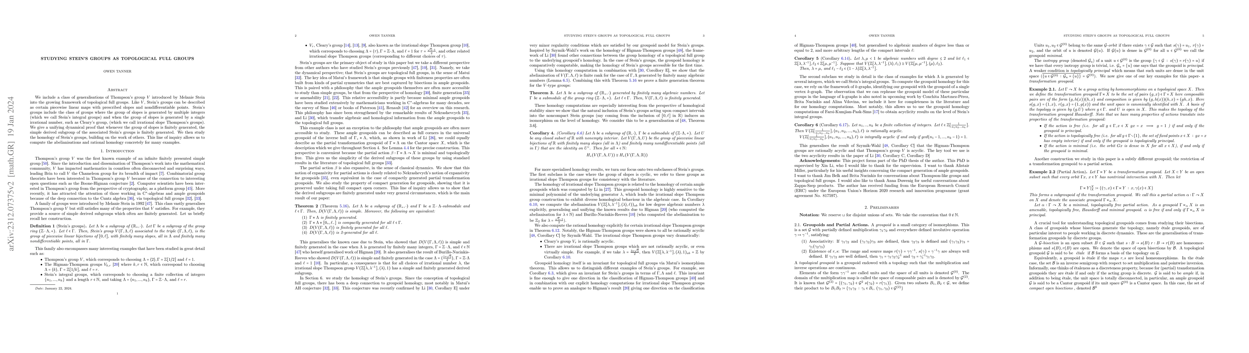 We include a class of generalisations of Thompson's group $V$ introduced by Melanie Stein into the growing framework of topological full groups. Like $V$, Stein's groups can be described as certain piecewise linear maps with prescribed slopes and nondifferentiable points. Stein's groups include the class of groups where the group of slopes is generated by multiple integers (which we call Stein's integral groups) and when the group of slopes is generated by a single irrational number, such as Cleary's group, (which we call irrational slope Thompson's groups). We give a unifying dynamical proof that whenever the group of slopes is finitely generated, the simple derived subgroup of the associated Stein's groups is finitely generated. We then study the homology of Stein's groups, building on the work of others. This line of inquiry allows us to compute the abelianisations and rational homology concretely for many examples.