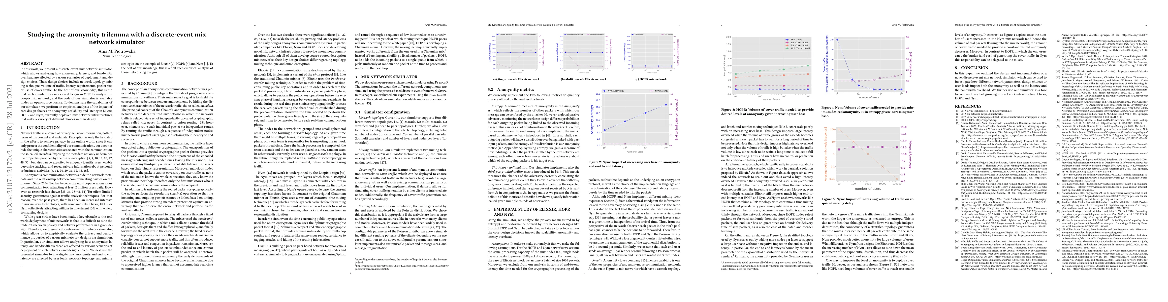 Researchers created a simulator to study how design choices in mix networks affect anonymity, latency, and bandwidth overhead. The simulator was used to analyze three deployed mix network infrastructures and found key insights into core design choices.