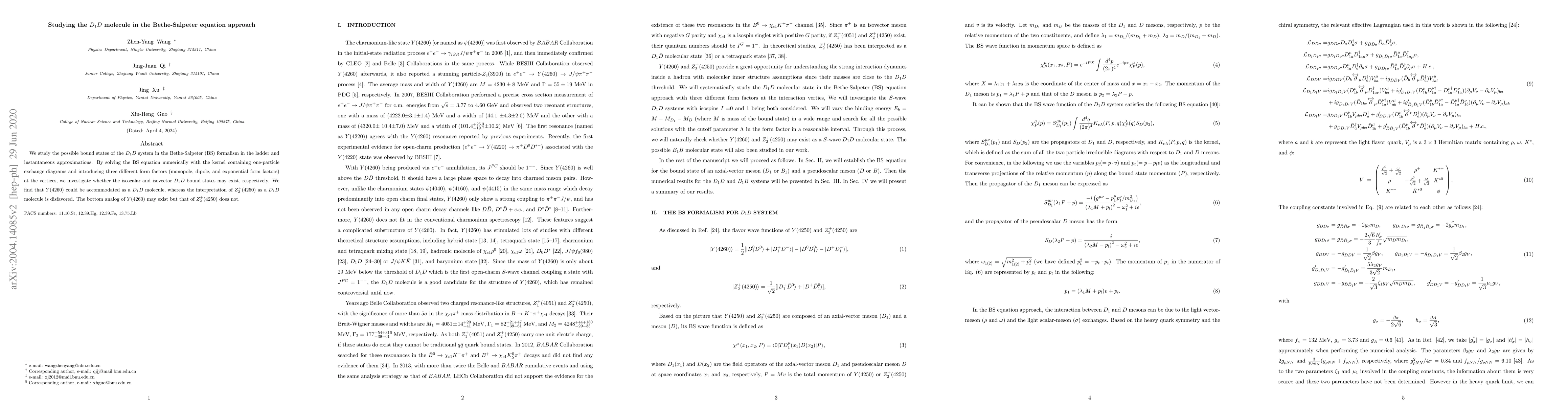 This paper investigates the potential bound states of the $D_1D$ system using the Bethe-Salpeter equation in ladder and instantaneous approximations. It finds that $Y(4260)$ can be interpreted as a $D_1D$ molecule, while $Z_2^+(4250)$ is unlikely to be one.