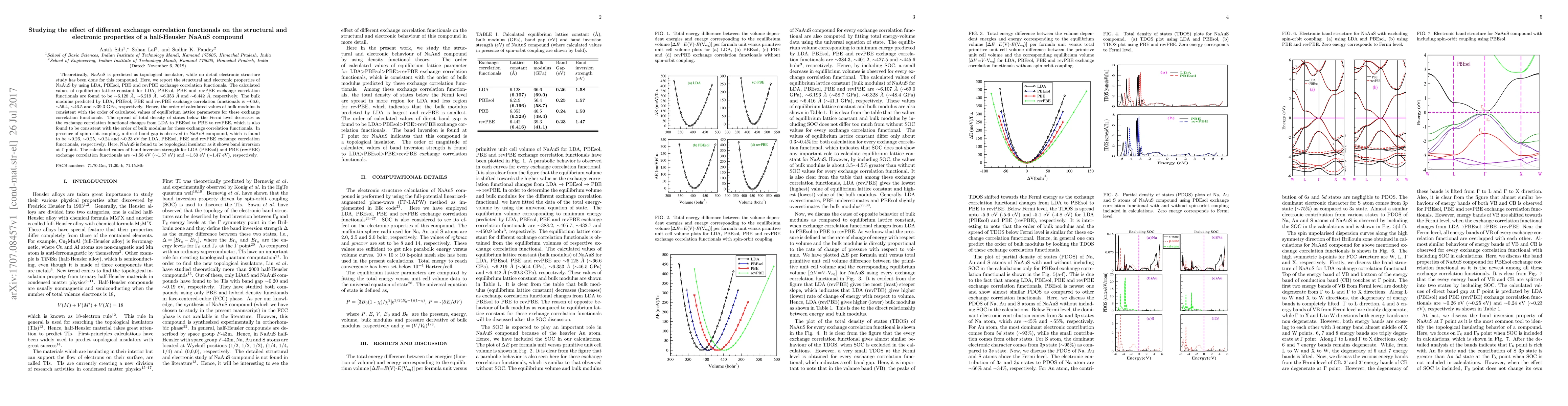 This paper calculates structural and electronic properties of NaAuS using different exchange correlation functionals, finding it to be a topological insulator with varying band gaps and bulk moduli depending on the functional used.