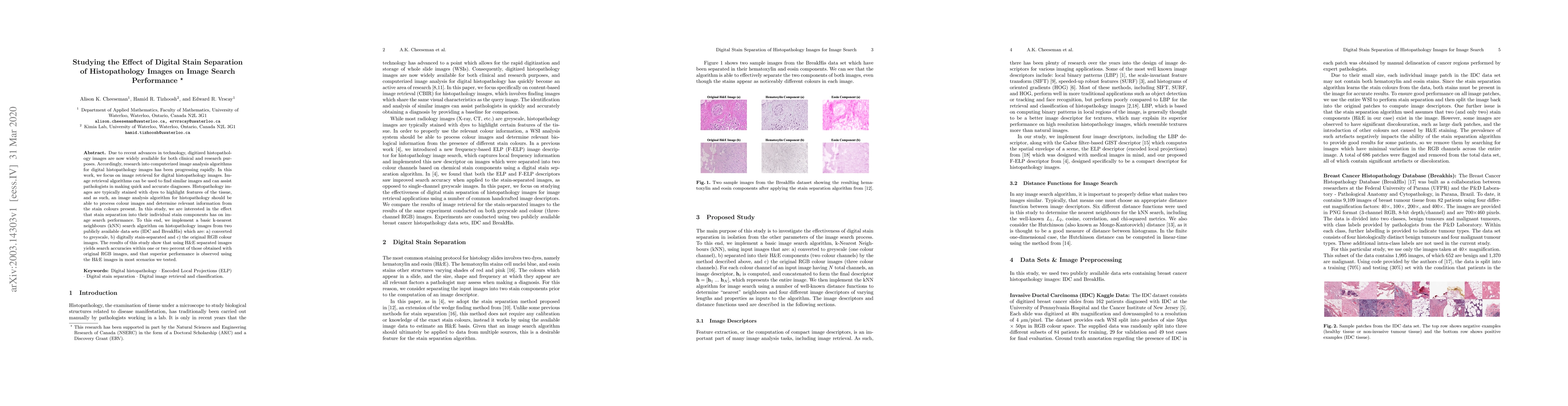 This study investigates the impact of digital stain separation on the performance of image search algorithms for histopathology images. Results show that separating stains into individual components, particularly H&E, improves search accuracy compared to greyscale or original RGB images.