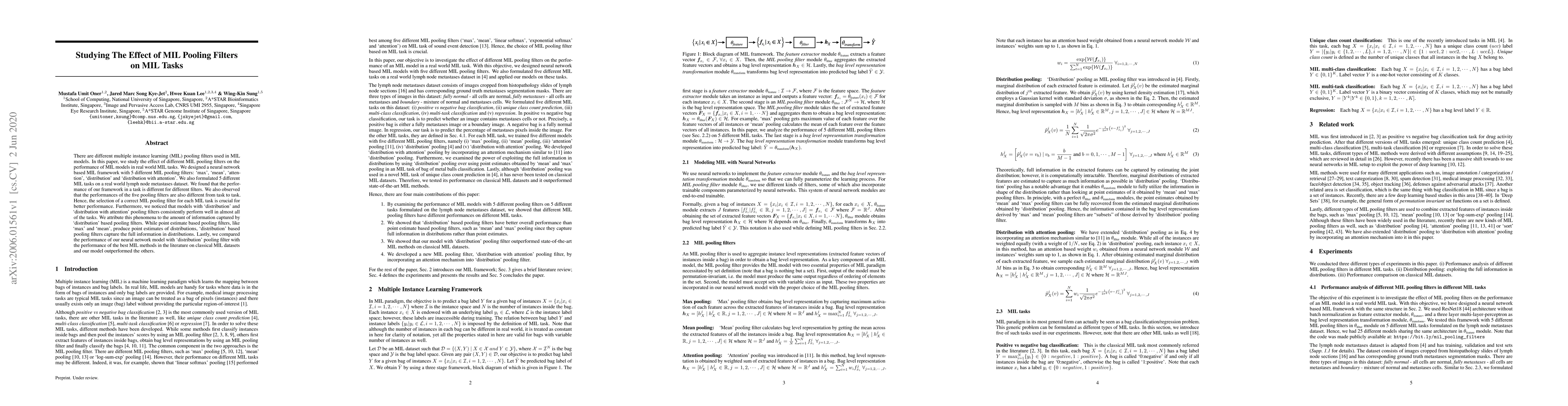 There are different multiple instance learning (MIL) pooling filters used in MIL models. In this paper, we study the effect of different MIL pooling filters on the performance of MIL models in real world MIL tasks. We designed a neural network based MIL framework with 5 different MIL pooling filters: `max', `mean', `attention', `distribution' and `distribution with attention'. We also formulated 5 different MIL tasks on a real world lymph node metastases dataset. We found that the performance of our framework in a task is different for different filters. We also observed that the performances of the five pooling filters are also different from task to task. Hence, the selection of a correct MIL pooling filter for each MIL task is crucial for better performance. Furthermore, we noticed that models with `distribution' and `distribution with attention' pooling filters consistently perform well in almost all of the tasks. We attribute this phenomena to the amount of information captured by `distribution' based pooling filters. While point estimate based pooling filters, like `max' and `mean', produce point estimates of distributions, `distribution' based pooling filters capture the full information in distributions. Lastly, we compared the performance of our neural network model with `distribution' pooling filter with the performance of the best MIL methods in the literature on classical MIL datasets and our model outperformed the others.