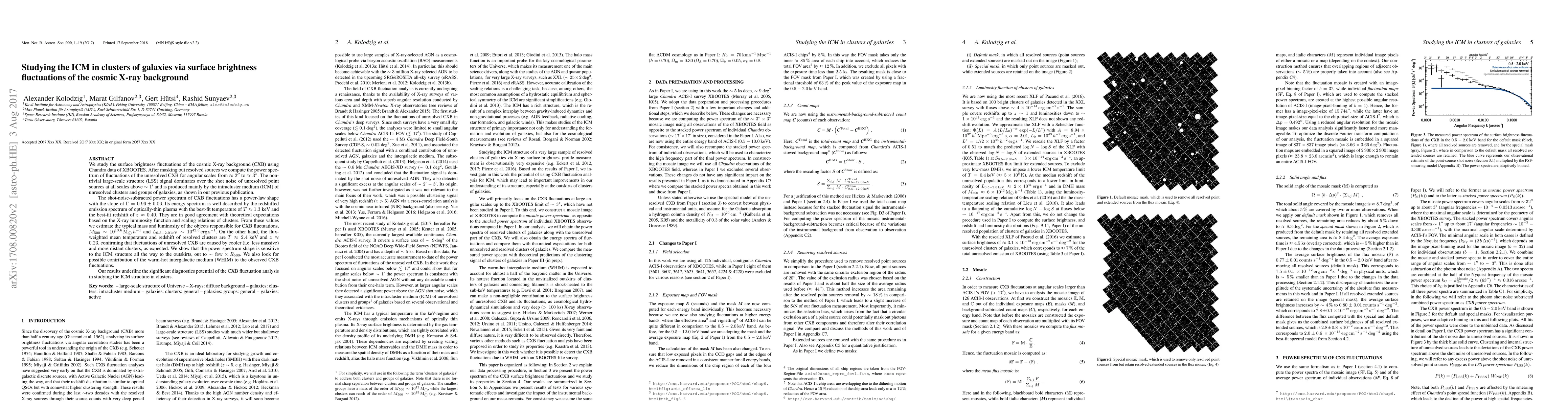 This paper investigates the intracluster medium (ICM) in galaxy clusters using surface brightness fluctuations of the cosmic X-ray background (CXB) from Chandra data. The study finds that fluctuations are primarily due to unresolved clusters and groups, with a best-fit temperature of 1.3 keV and redshift of 0.40, indicating cooler, more distant clusters.
