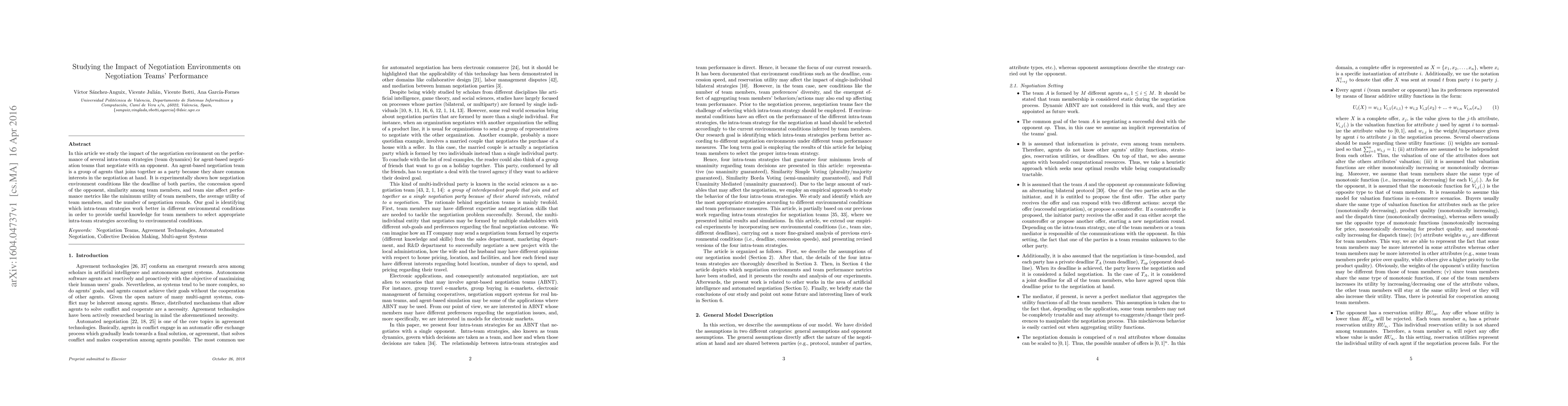 This paper investigates how various negotiation environment factors, such as deadlines, opponent concession speed, team member similarity, and team size, impact the performance of agent-based negotiation teams. The study aims to identify optimal intra-team strategies under different conditions to guide team members in selecting the best strategies for their specific negotiation contexts.
