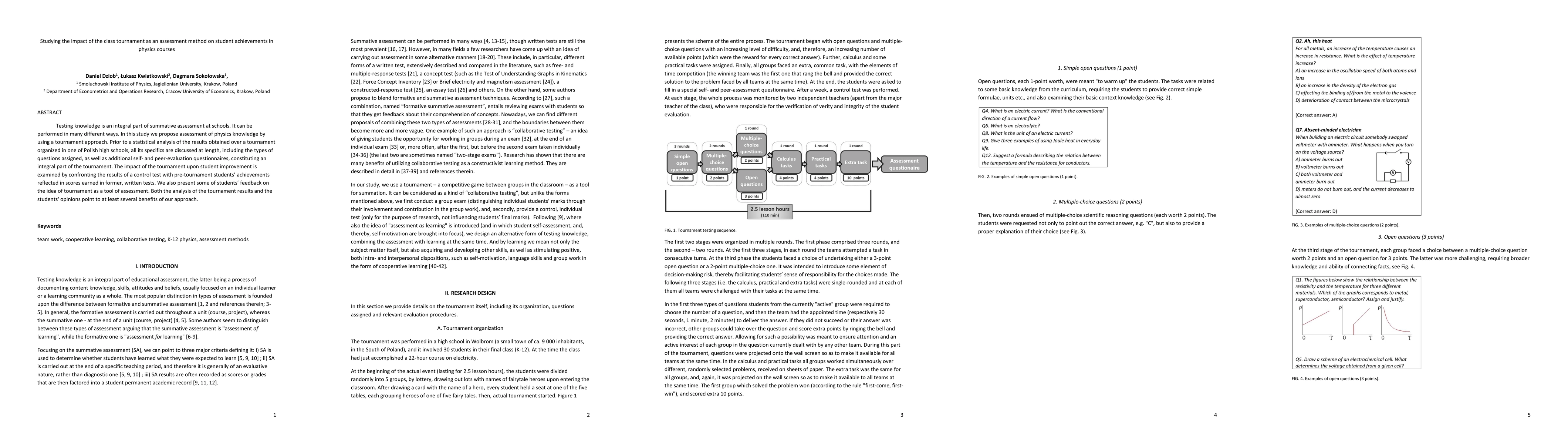 A study investigated using a tournament approach as an assessment method for physics courses, finding benefits in student improvement and feedback. The results showed that the tournament approach can be an effective tool for assessing student knowledge.